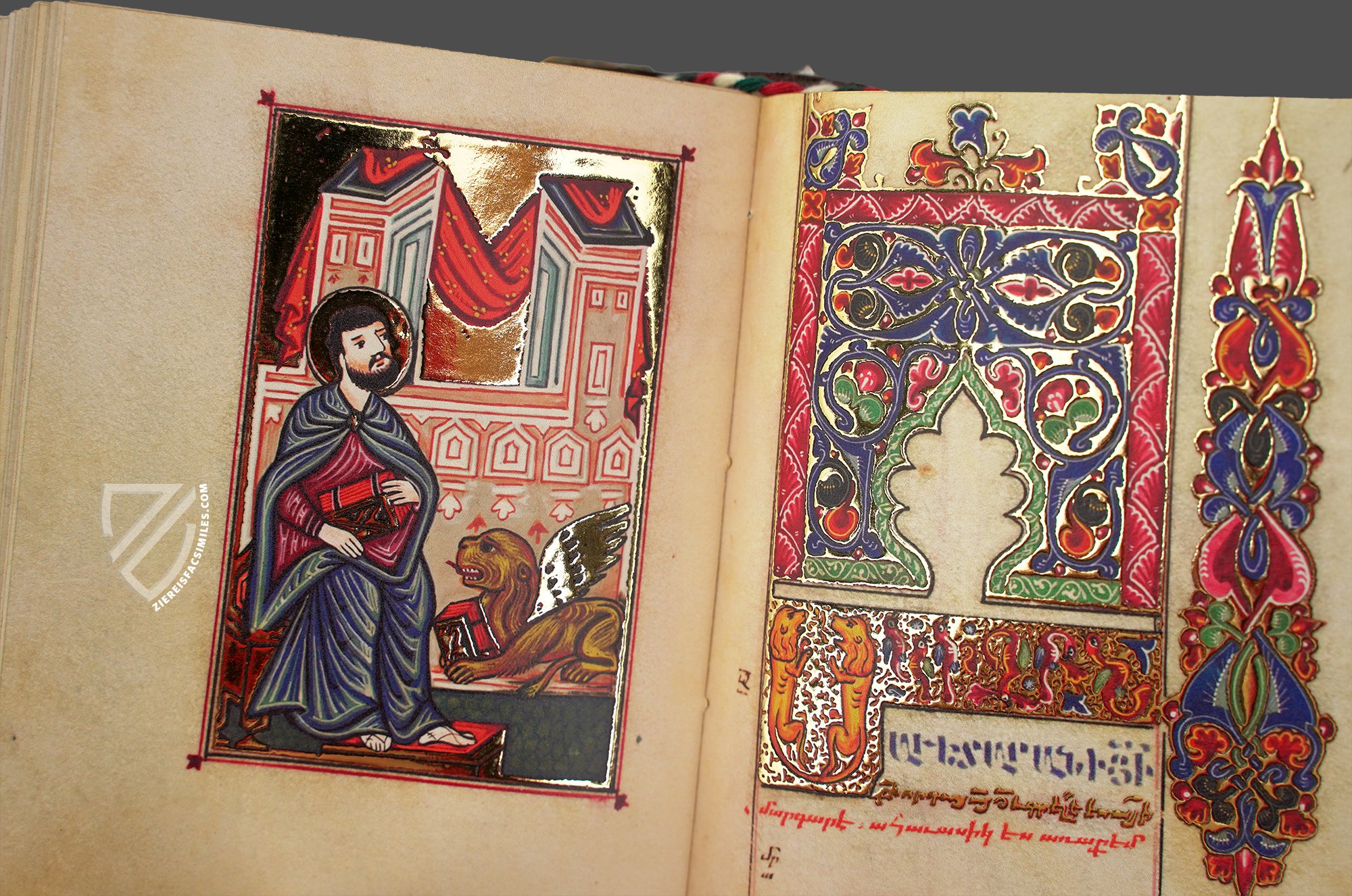 The miniatures, designed according to the rules of Armenian illumination, distinguish themselves through their particular luminosity and fineness. It is astonishing how radiant the colors are and the intensity boasted by the gold backgrounds. As such, there is a six-figure Adoration scene playing out before unpretentious urban architecture and in whose background shines the golden heavens. Nevertheless, the bordure decorations boast rich gold as well and small marginal scenes illustrate the text additionally. The beginning of each Gospel is designed in an exceptionally splendid manner, as exhibited with a full-page miniature of the corresponding Evangelist.