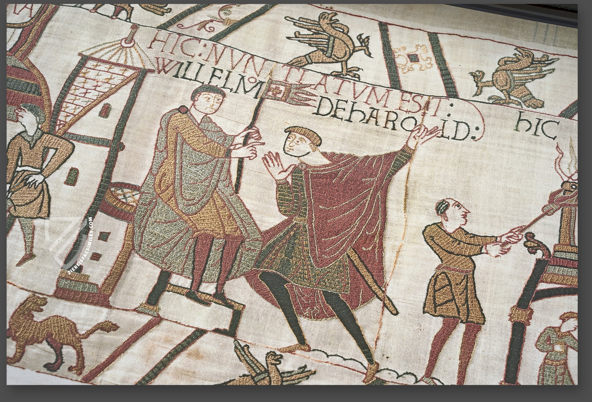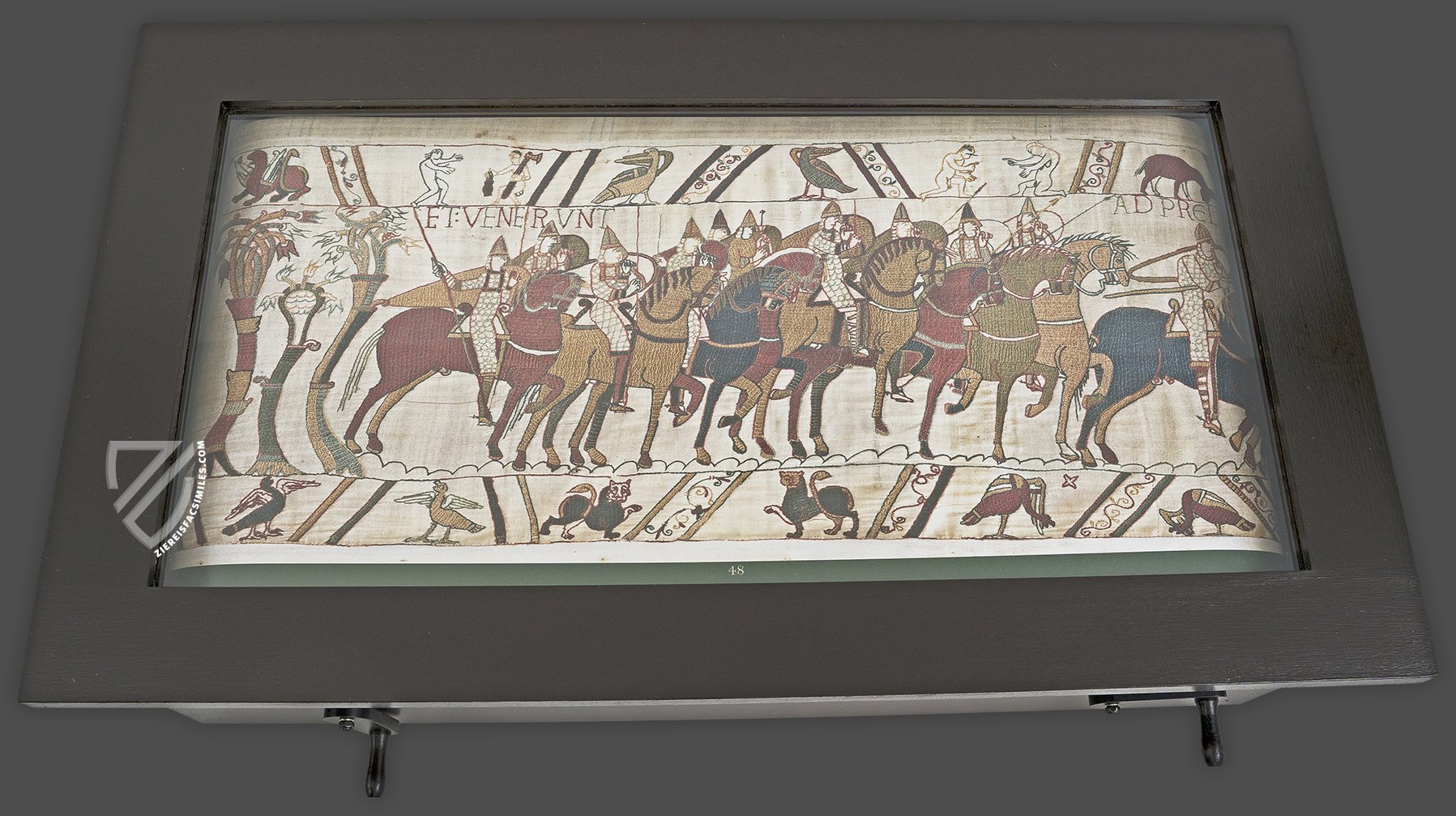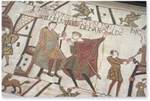 After the Battle of Hastings in October 1066, the history of the Kingdom of England and the whole of Europe changed completely. This momentous event, marked by the death of the last Anglo-Saxon king and the dawn of Norman rule in England, is recorded in the pictorial chronicle of the Bayeux Tapestry. Thanks to the excellent craftsmanship of the work and its careful preservation in Bayeux Cathedral, where it has survived the centuries, the Romanesque work of art has remained virtually undamaged for some 950 years. The extensive embroidery, made in the years immediately following the Battle of Hastings, depicts the events of the years 1064 to 1066 with impressive narrative clarity and dynamism over a length of almost 70 meters and in 58 individual scenes. The tapestry is not only of unique historical importance, but is also considered to be one of the most important artistic creations of the Norman Romanesque period.