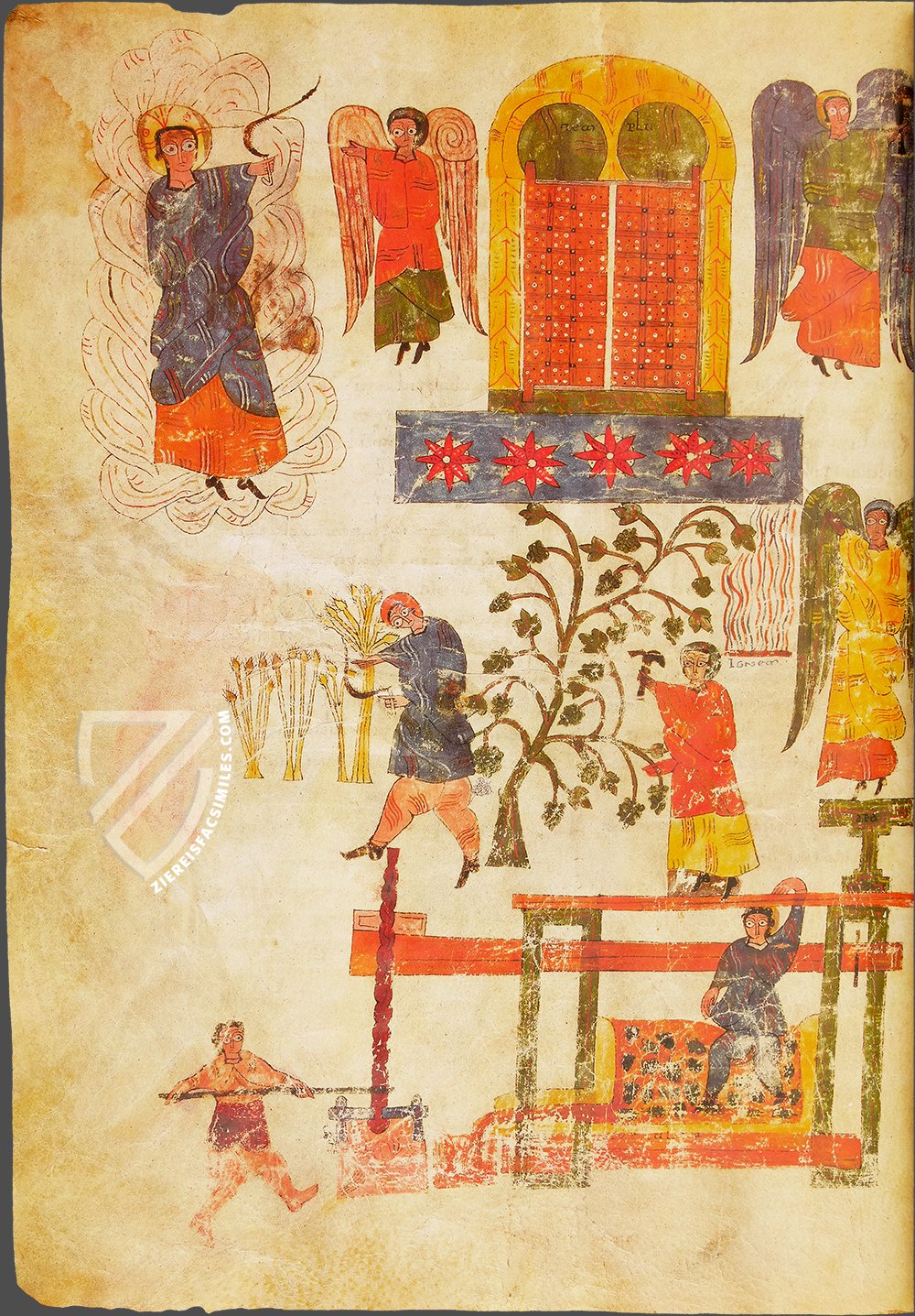 A vine connects the earthly harvesters, one of whom is cutting wheat, with their angelic overseers in Heaven, which is represented by an altar at the top of the page. Meanwhile, the bottom register shows a realistic depiction of a medieval winepress: “So the angel thrust his sickle into the earth and gathered the vine of the earth, and threw it into the great winepress of the wrath of God.” (Rev. 14:19)