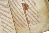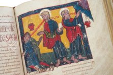 This miniature is exemplary of Mozarabic art, which is characterized by bold shapes, opaque primary colors, heavy patterns, and flat, stylized figures without shading. Their two-tone garments consist of simple shapes and folds drawn with black or white lines. Finally, an unfinished manicule in the right margin points to the roundel.