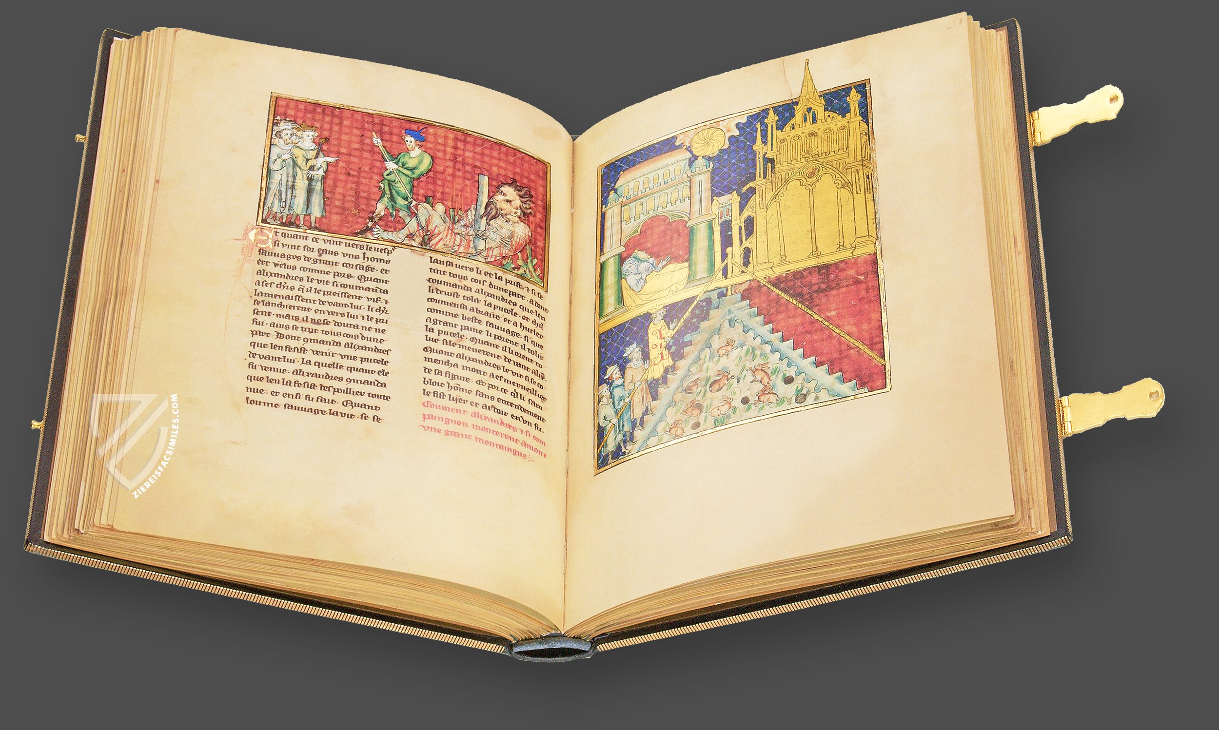 Before the invention of the printing press, the chivalric romance about Alexander the Great was the most commonly translated, most widely disseminated, and most read book of world literature. It was reworked countless times, almost all the specimens of the work are very diversely illustrated. The Berlin Alexander Romance is a translation based on a French version of the story. Berlin’s Histoire du bon roi Alexandre is counted among the most famous and precious adaptations of the book. This text originated from the end of the 13th century. The 168 lavishly designed pages are furnished with real gilt edges all around. Over 100 miniatures with lush gold embellishments adorn the splendid work. The pictures relate the fantastic round-the-world trip, of important battles, and of strange mythical creatures. Alexander encountered dragons, griffins, cyclopes, giant crabs, figures with horse heads, and humanoid cephalopods. In one place, Alexander ascends into the sky with the help of a daring construction carried by birds of prey; in another, he descends to the bottom of the ocean with a diving bell. The ancient legends about the great ruler were packaged into medieval garb here. Numerous captions comment on the scenes depicted, usually with a wink. In each case, the illustrations of the Berlin Alexander Romance belong among the most beautiful miniatures to be created in 13th century Europe.