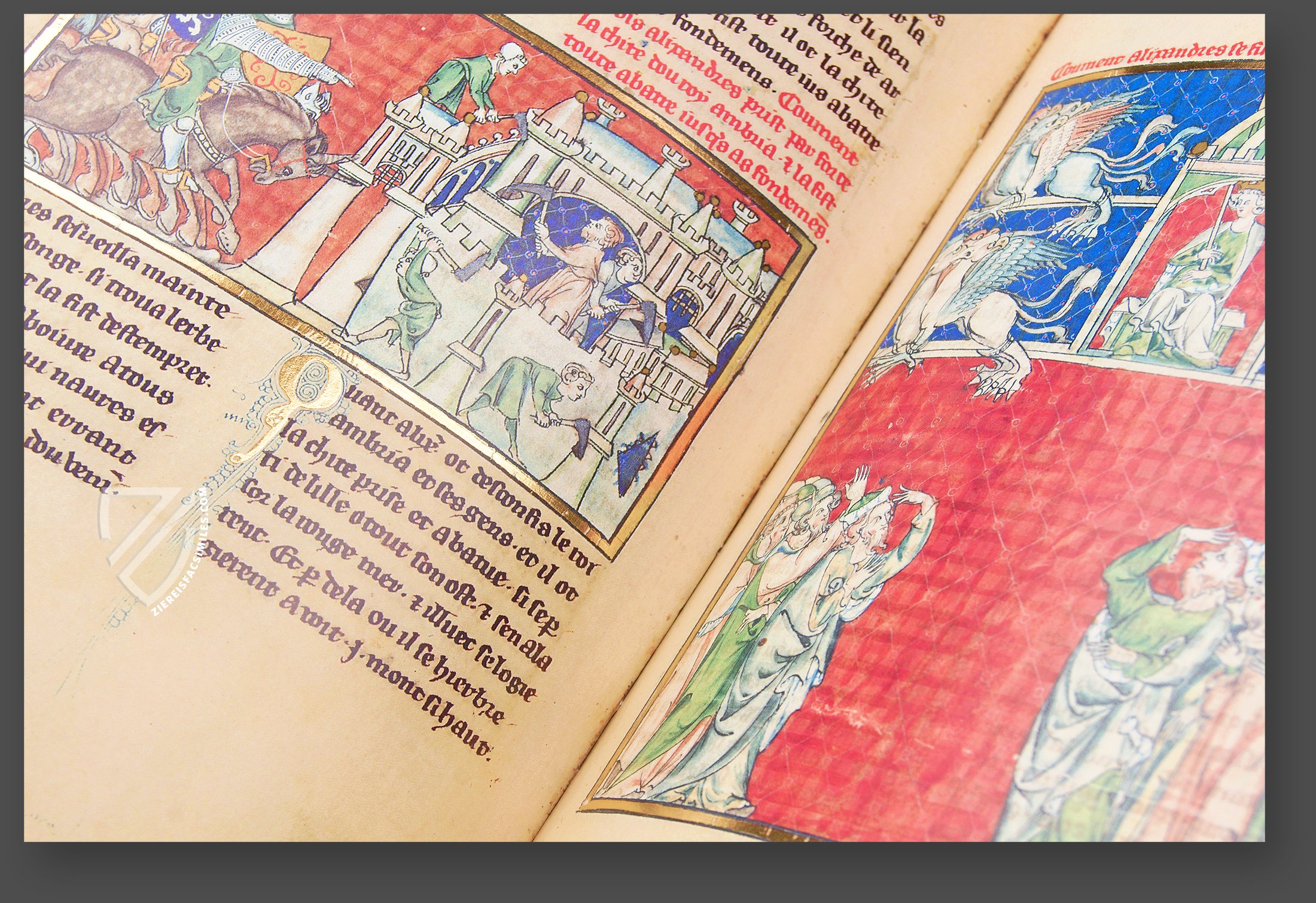 The Alexander Romance was one of the most popular literary works during the Middle Ages. It described the Macedonian conqueror as an honorable and generous king who is benevolent and noble to all who are wretched, remains humble despite of his victories, and never fails to honor the gods. A specimen of the book, which is stored today in Berlin, distinguishes itself through its elaborate illustration and lavish gold adornment. The so-called Berlin Alexander Romance is a chivalric romance concerning the life of Alexander the Great, which was assembled from descriptions of true events and fantastic legends. It originated at the end of the 13th century and contains over 100 magnificent miniatures illuminated with gold and silver depicting exotic locations, important battles, and mythical monsters.