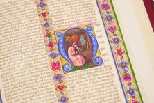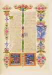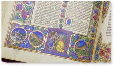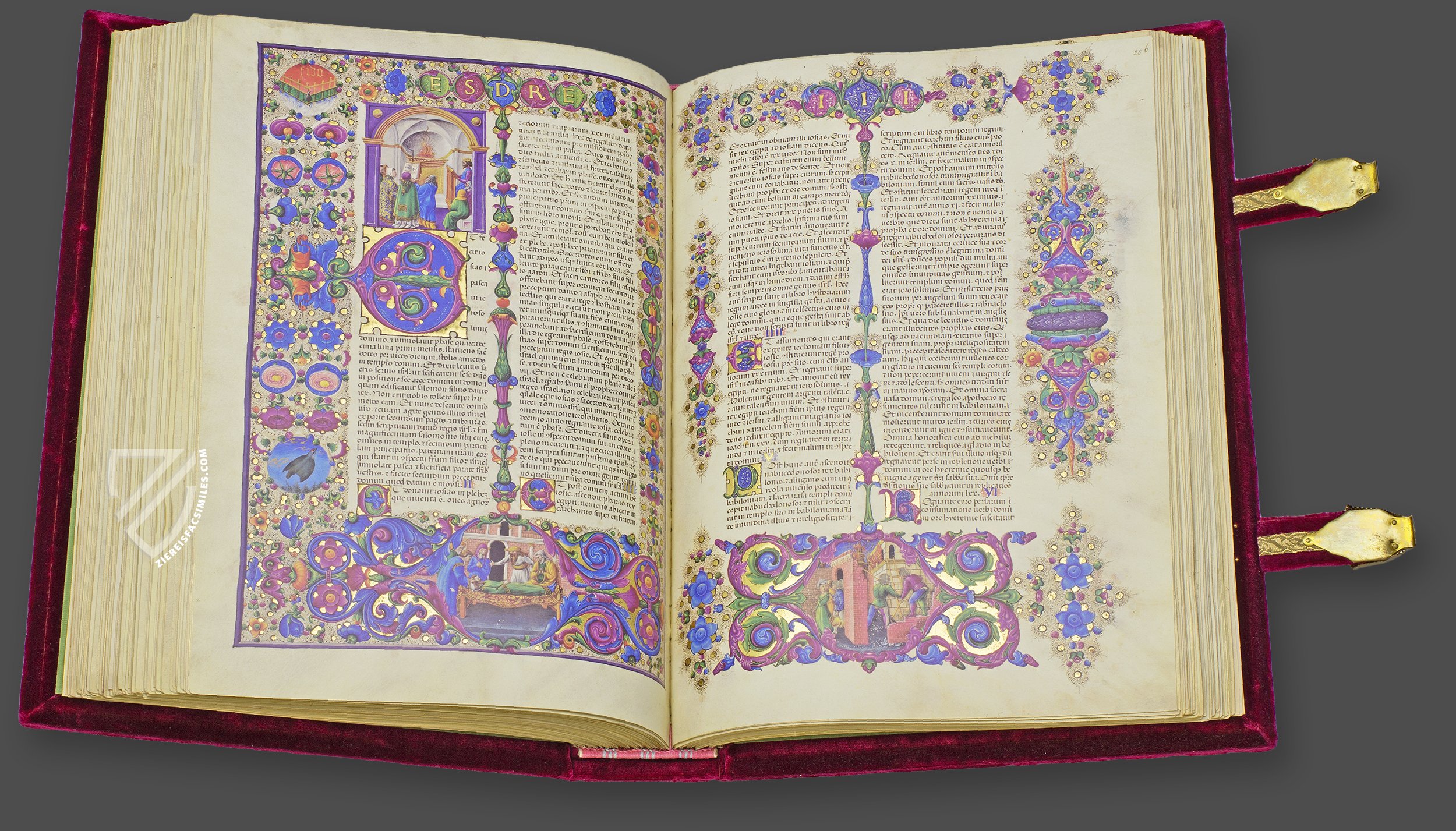The hand-written text of the Renaissance bible is decorated with countless initials and embellished letters in luminous colors and with shimmering applications of gold leaf. Numerous full-page miniatures of surprising realism visualize the events reflected in the text and enthrall every beholder. Especially noteworthy are the marginal embellishments of each page, which show an unbelievable variety of motifs from mythology, the animal kingdom, and heraldry. In this codex, the masterful illuminators managed to merge the new visual language of the Renaissance with the fantasy and elegance of the late Gothic. The bible represents the absolute highpoint of Italian Renaissance illumination.