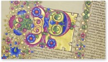 The tremendous talent of the artists led by Taddeo Crivelli and Franco dei Russ allows for the harmonious presentation of an otherwise overwhelming cacophony of illumination on this page, which covers Genesis 1:1β20 in six miniatures in the margins. The Creator is depicted throughout with a triangular halo, a late-medieval invention signifying the Trinity and only used with God the Father. These are accompanied by floral designs, animals, grotesques, and architectures of the highest caliber.