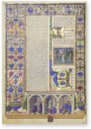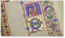 - Numerous scenic miniatures, historiated initials, border friezes, architectural border motifs, heraldic rectangular fields and medallions