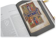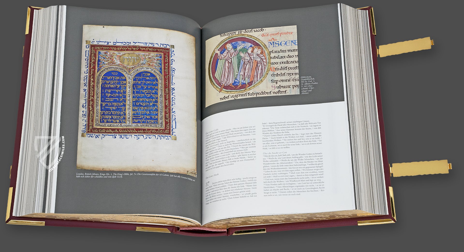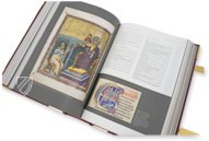 The Bible of Compassion is not a facsimile in the strict sense. Rather, the texts of the Old and New Testaments have been brought together with more than 350 exquisite miniatures from medieval and Renaissance manuscripts in a luxurious German-language household Bible - 270 of which are decorated with gold foil. The small works of art were compiled from various codices kept in 40 of the most important manuscript collections in the world. They include book treasures from almost all epochs of Christian medieval illumination, such as the splendid Ottonian Strahov Evangeliary, the famous Romanesque St Albans Psalter and the ornate Gothic Hamilton Bible, as well as the monumental Salzburg Missal and the opulent Renaissance Bible by Federico da Montefeltro. The high-quality leather binding is also adorned with a ruby-studded detachable cross and fitted with two book clasps.