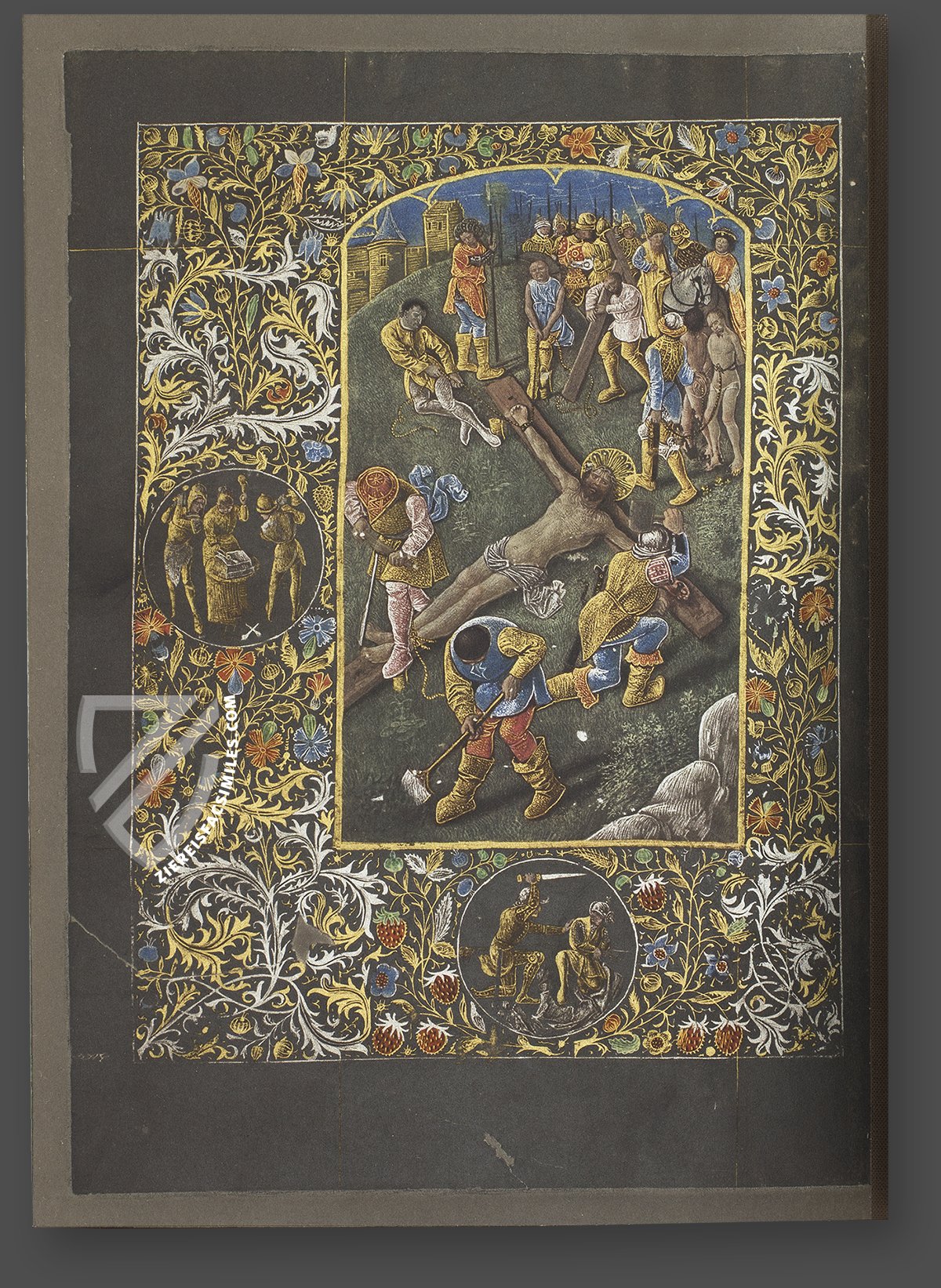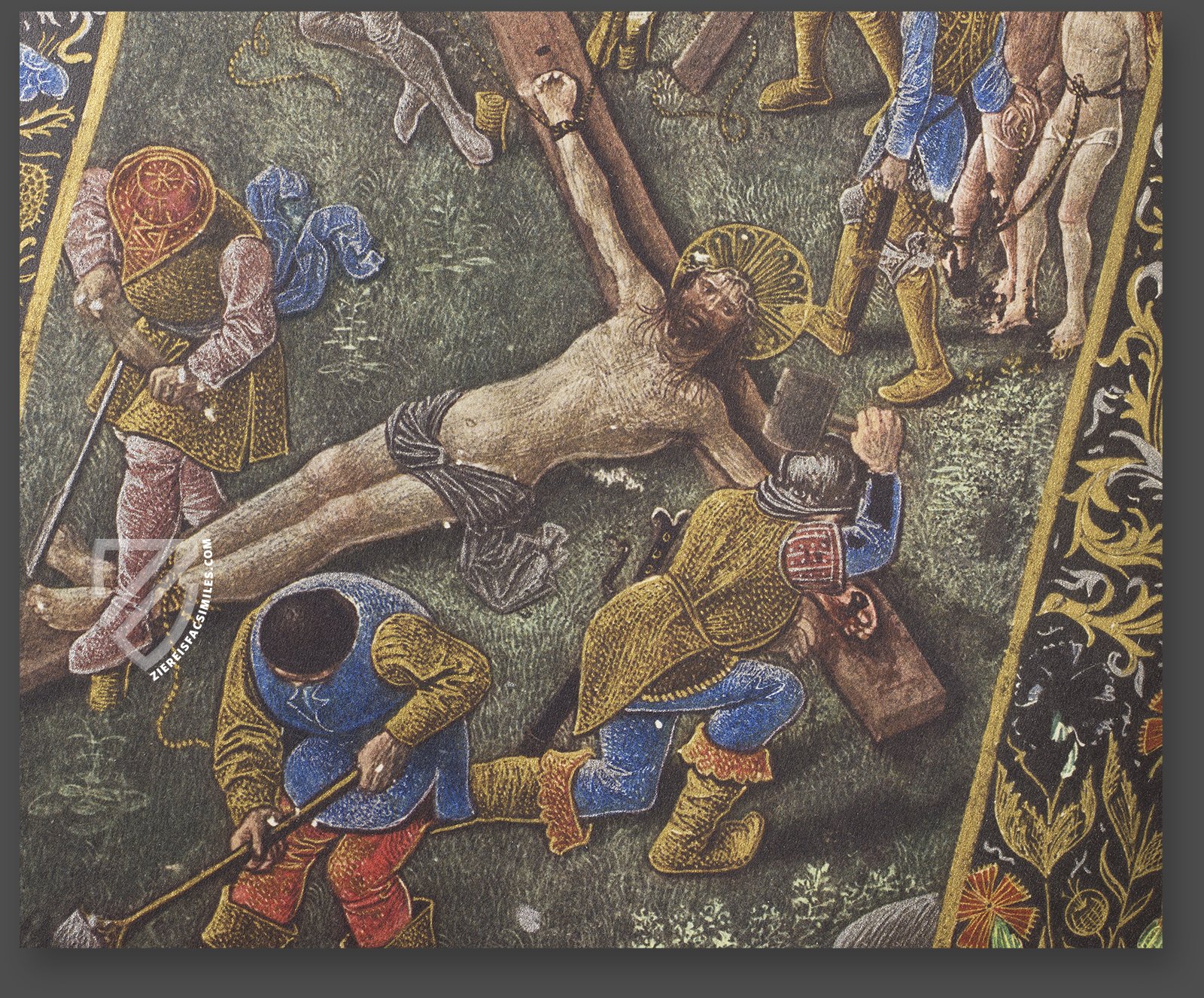 In the primary miniature, soldiers are depicting nailing Christ to the cross and digging a hole in the ground for it. The two thieves who are to be crucified alongside Christ are seen in the background, as is Pontius Pilate, depicted on horseback with an armed escort. This famous miniature is a masterpiece, like the rest of the manuscript.