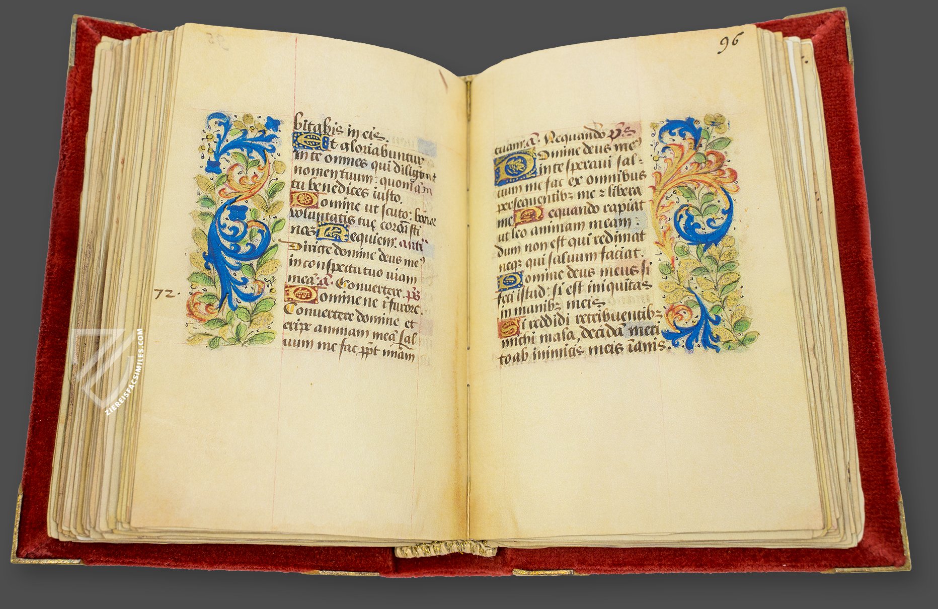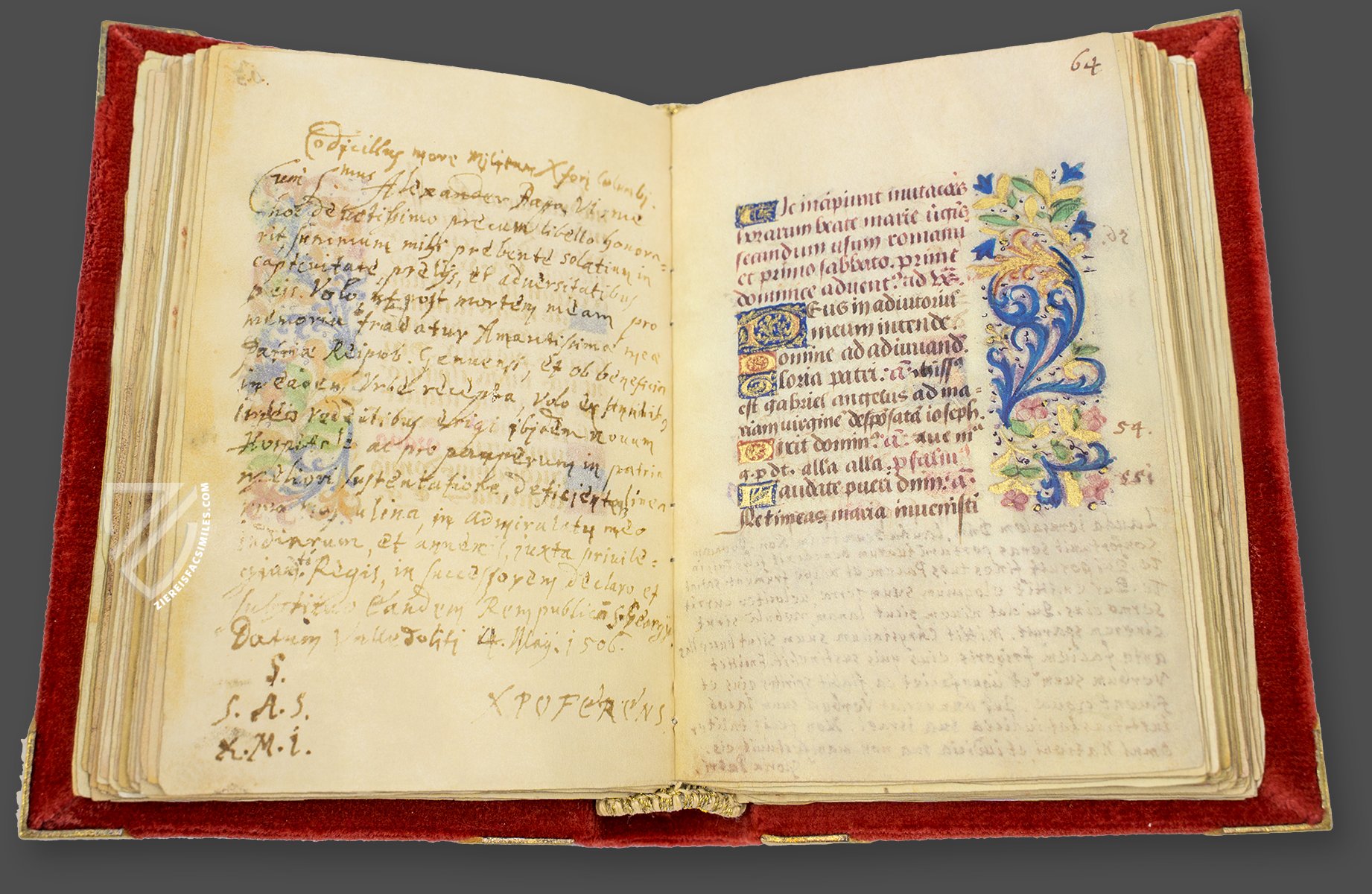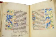 This book of hours was gifted to Columbus by Pope Alexander VI, the so-called Borgia Pope, a man who like Columbus is famous and infamous in equal measure. The high quality of its design is evident in the uniformity with which the golden βSβ initials have been written in front of alternating red and blue backgrounds, as well as the quality of the floral dΓ©cor, which is also executed with gold leaf.