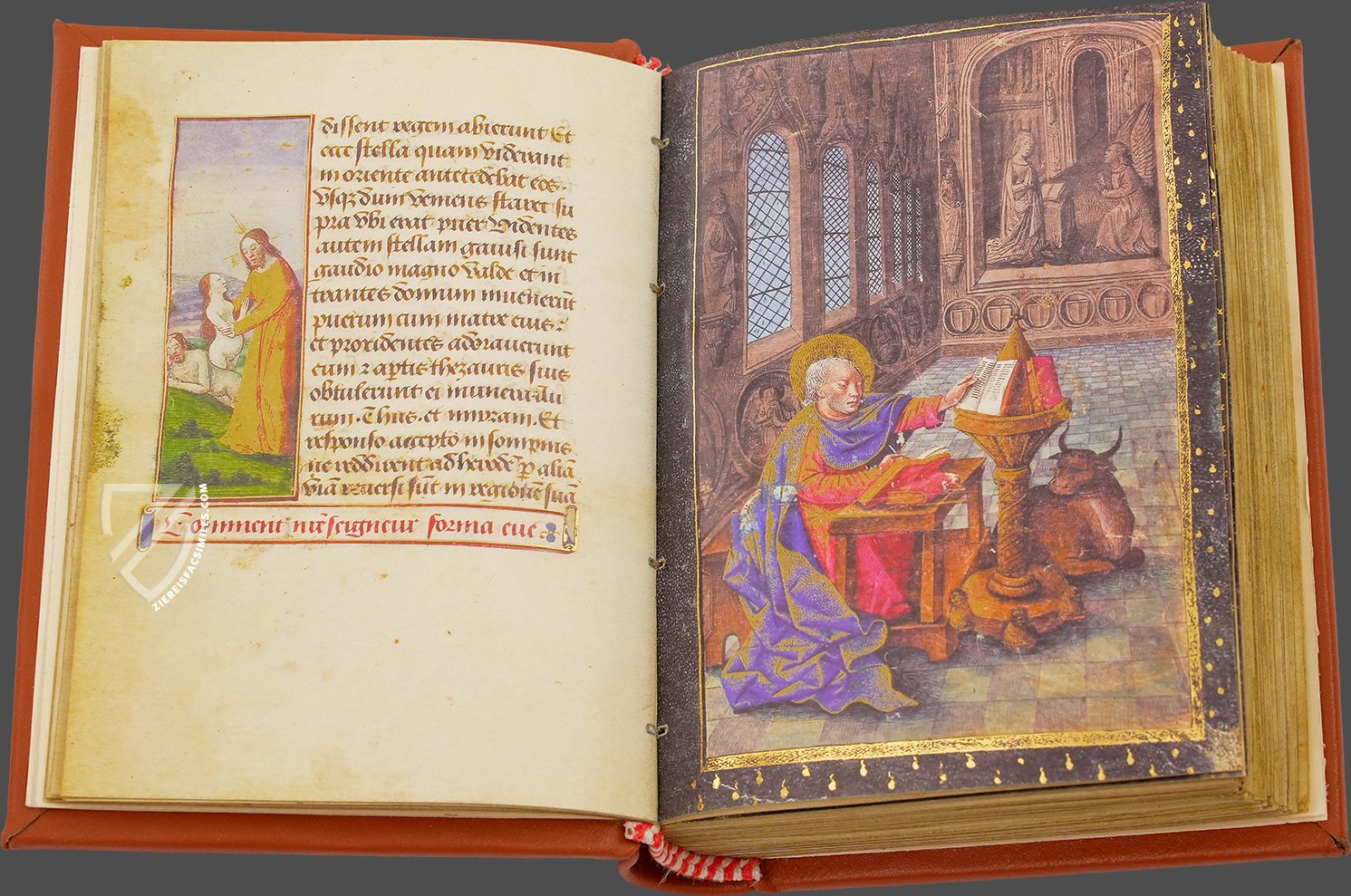 The so-called Book of Hours of Besançon is an exceptional attestation of the art of 15th century French illumination. The 386 pages of the personal prayer book were adorned throughout with full-page miniatures, figurative scenes in the frames, or simply gorgeous initials. Jean Colombe is believed to be the master of this magnificence, the famous French painter who was employed, inter alia, by high-ranking patrons like Louis de Laval. His name is additionally associated with the Très Riches Heures by the Limbourg Brothers for the Duc de Berry. The Book of Hours of Besançon glimmers with exceptional compositions and a special treatment of light and landscape in the grandiose miniatures!