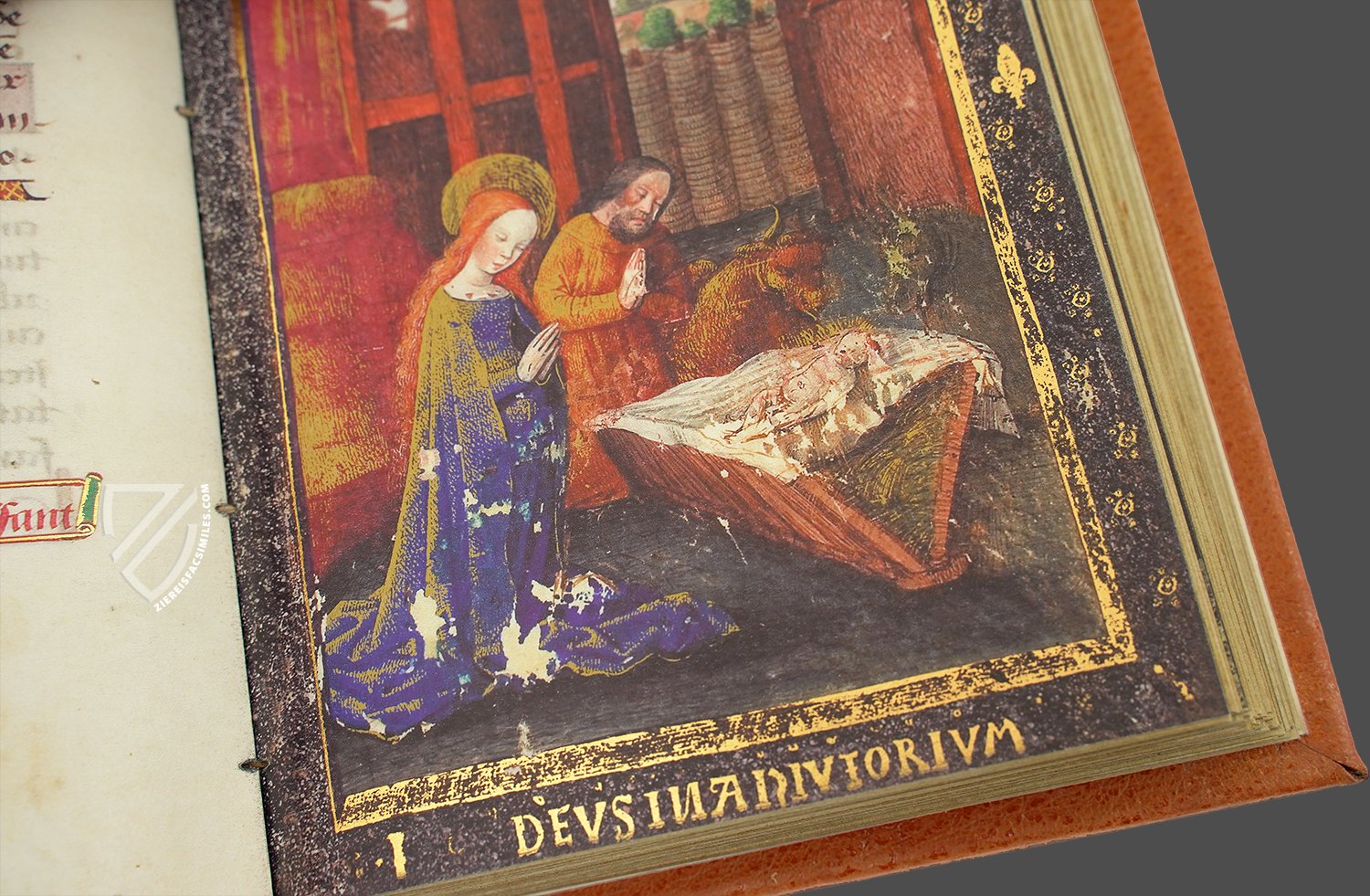 The so-called Book of Hours of Besançon is an exceptional attestation of the art of 15th century French illumination. The 386 pages of the personal prayer book were adorned throughout with full-page miniatures, figurative scenes in the frames, or simply gorgeous initials. Jean Colombe (1430–1493) is believed to be the master of this magnificence, the famous French painter who was employed, inter alia, by high-ranking patrons like Louis de Laval. His name is additionally associated with the Très Riches Heures by the Limbourg Brothers for the Duc de Berry. The splendid prayer book glimmers with exceptional compositions and a special treatment of light and landscape in the grandiose miniatures!