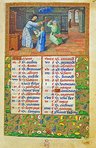 While most illustrated medieval calendars show various labors of the month or other bucolic scenes, some, like the one in this extraordinary book of hours, trace human life from beginning to end. Two brothers are usually presented growing up together, one pious and one sinful, who in December find their way to Heaven and Hell, respectively.