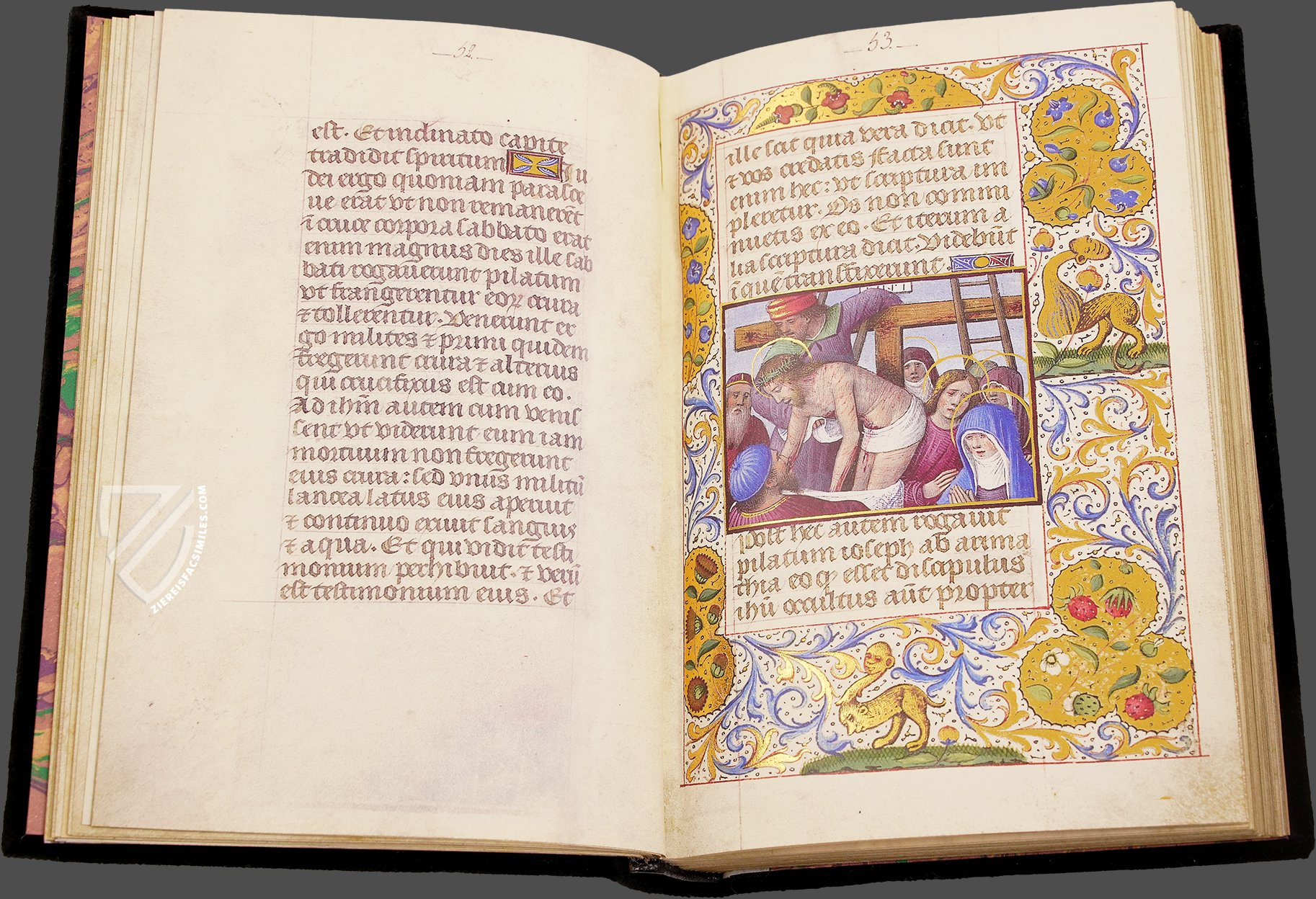 Hundreds of depictions of plants and animals accompany the primary figures, not only in the markedly beautiful bordures, but also in the miniatures themselves. Thus, John the Evangelist appears accompanied by a splendid eagle. It sits to the left of John with an open beak and arrayed plumage. All things considered, the biodiversity of the animals depicted is so great that in this regard that the book of hours resembles a complete medieval bestiary. In doing so, it is a fable allegorically connecting the moralizing characteristics of animals with the Christian doctrine of salvation.