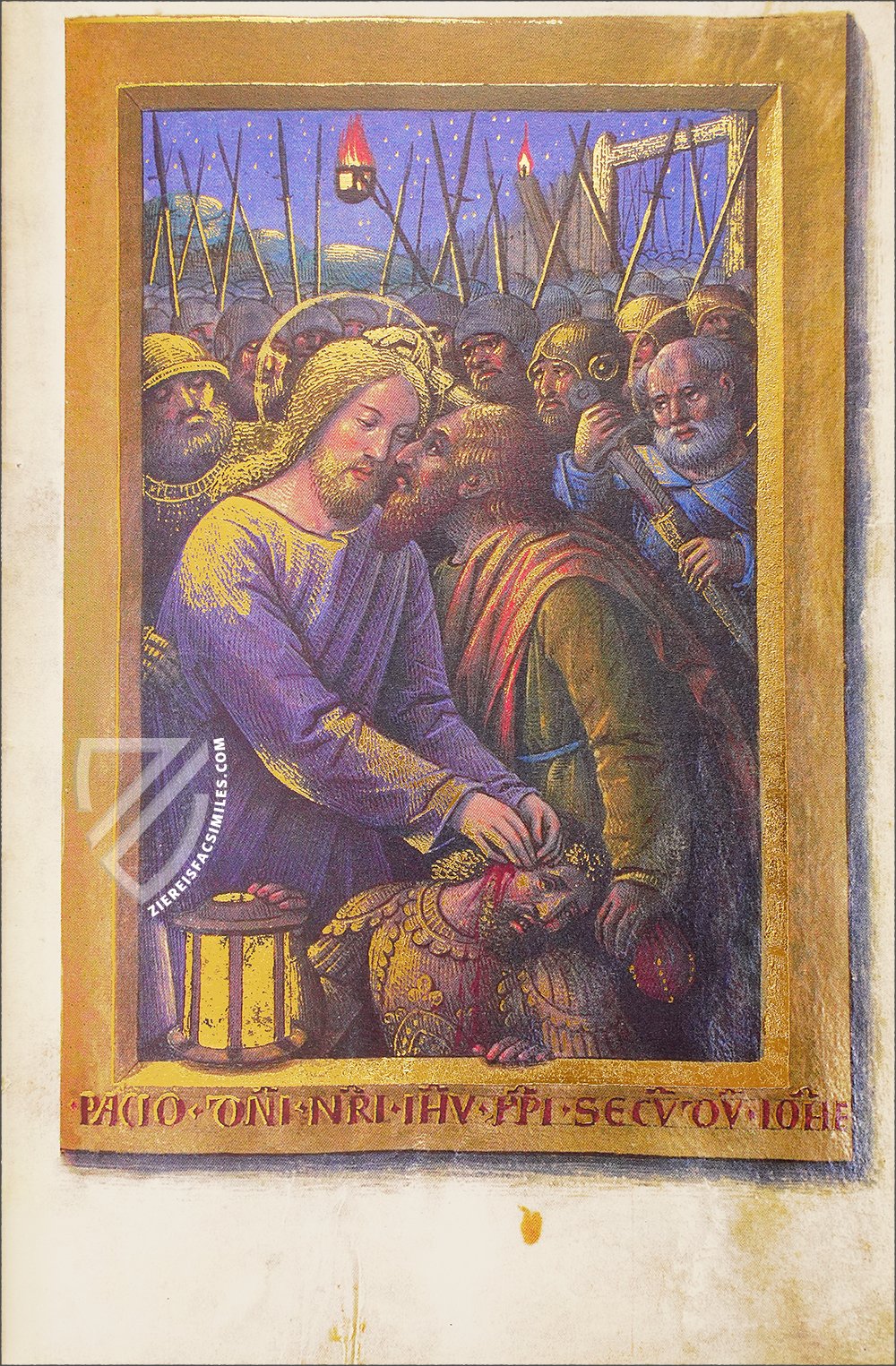 With Bourdichon, the typical execution of a gold background corresponds to an impressive landscape depiction. Whether merely serving as a background or not, the artist devotes serious attention to them. He reproduces a small fishing boat on a calm sea. Both castles and small cities are indicated on the highly coats. All of this is draped in blue evening light. In the miniature of the Betrayal, Bourdichon even augments the clear night sky with scattered stars.