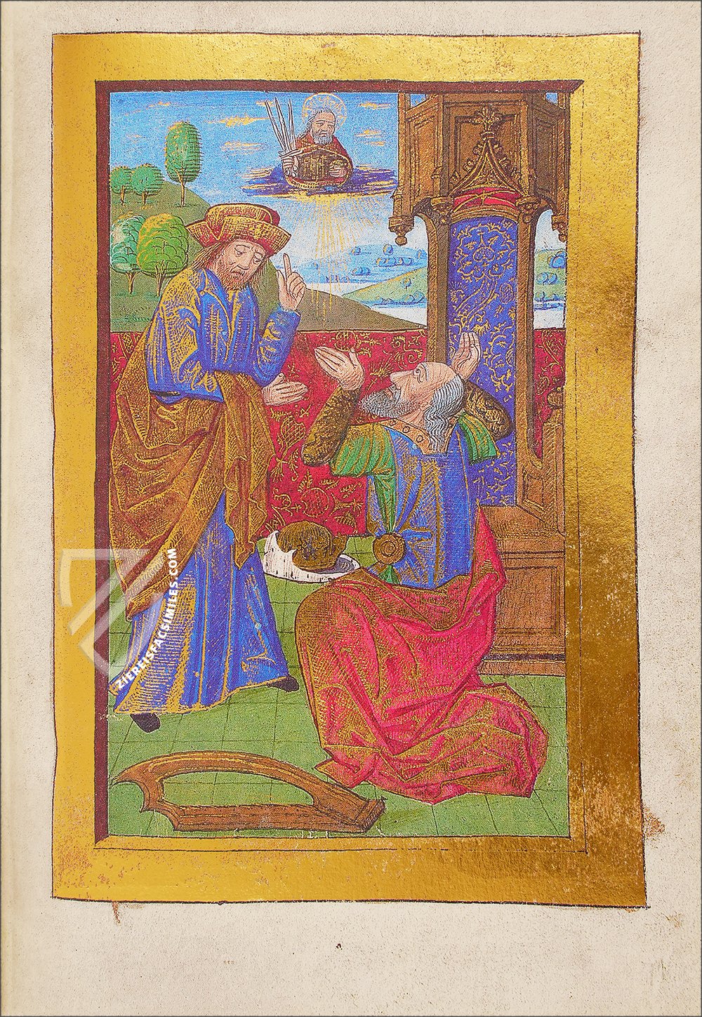 Flanked by his symbolic eagle, John’s purple tunic and red cloak are highlighted by the delicate application of gold leaf, with golden rays of divine inspiration coming down from above. The background consists of the Sea of Galilee, where he fished with his brother, James the Apostle. An illusionistic gold frame gives the miniature the appearance of a panel painting.