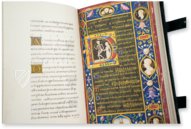 Francesco Boccardi furnished the book of hours with a few full- and even double-page miniatures with a clear connection to the content, which are furthermore designed in an extremely innovative way. Numerous smaller miniatures and countless splendid initials further this impressive pictorial decoration. Lavishly-designed bordures and trim are filled with illusionistic flowers, fruits, small animals like butterflies and birds, gemstones, heraldic motifs with a few small depictions of rulers found among them, and the heraldic badge of the Medici appears again and again. As one of the last books of hours of the Florentine Renaissance to be so splendidly designed overall, the manuscript is wonderfully rounded out with shimmering gold.