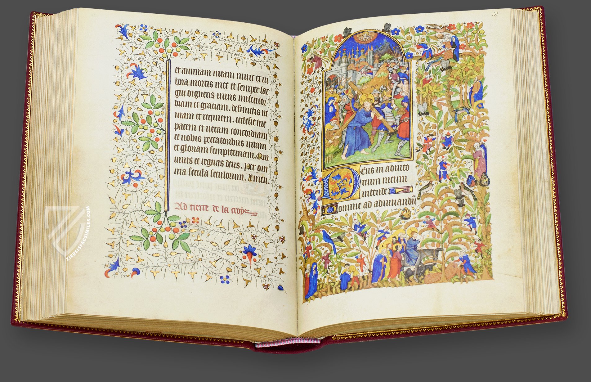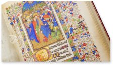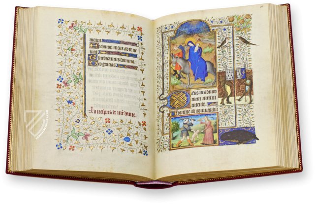 The Book of Hours of Marguerite d’Orléans originates from ca. 1426 and was created by a court illuminator who was known as the “Master of Marguerite d’Orléans.” The magnificent example contains some of the most beautiful miniatures of its epoch and is embroidered by its decorative borders, which frame the pages. Altogether it contains 41 luminously colored miniatures, framed with borders that present historical events, as well as 24 calendar medallions in gold frames. Contemporary scenes of medieval life are presented in never-before-seen variety and narrative delight. Marguerite d’Orléans was the granddaughter of King Charles V and great niece of the famous bibliophile Duke Jean de Berry. The manuscript features numerous monograms and the combined coat-of-arms of Margeurite and her husband Richard d´Etampes, Duke of Brittany, who probably commissioned the book of hours, which remained in possession of the French Crown for generations.