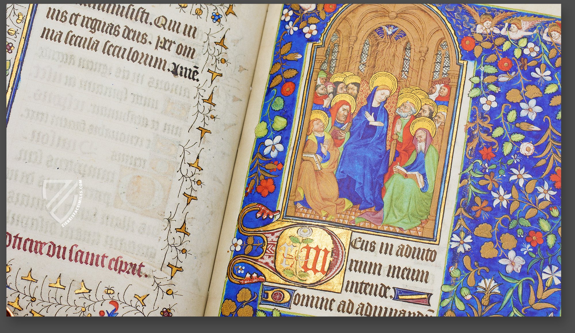 Books of hours are private prayer- and devotional books for the laity. The name correlates to the time of day or the particular hour of the day, at which time one should pray. In the Late Middle Ages, books of hours were especially beloved among the French nobility and were quite common. A prominent work of this kind is the Book of Hours of Marguerite d’Orléans, a magnificent codex that was begun around 1426 and was finished around 1450. Its fame continues to this day. The masterpiece contains 420 pages with 41 luminously colored miniatures, framed with borders that present historical events. Furthermore, there are 24 calendar medallions in gold frames. The work offers a artistically valuable overview of life in the 15th century.