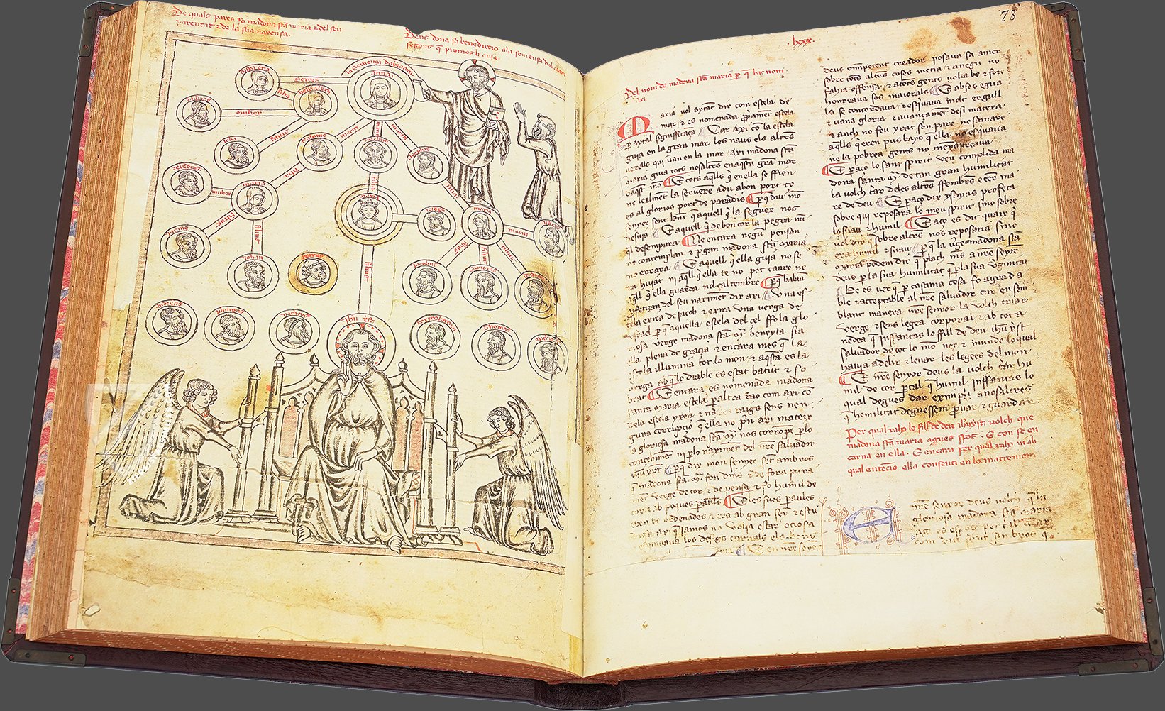 By the term troubadour, one means a bard, composer, and singer of courtly medieval poetry and song. Troubadour poetry enjoyed great popularity particularly in southern France in the 12th and 13th centuries. An exceptionally gifted representative of this art form was the Franciscan monk of Matfre Ermengaud. He composed an influential text around the time period between 1288 and 1320, which in the literary genre of troubadour poetry has been cited and newly interpreted in an incomparable manner. His so-called Breviari d'Amor, which can be translated as the Book of Hours of Love, considered to be one of the most important works of Occitan poetry. The masterpiece lying before us is a 15th century Spanish translation. It is illustrated with breathtaking miniatures, which are embellished with coloring and precious gold leaf elements.