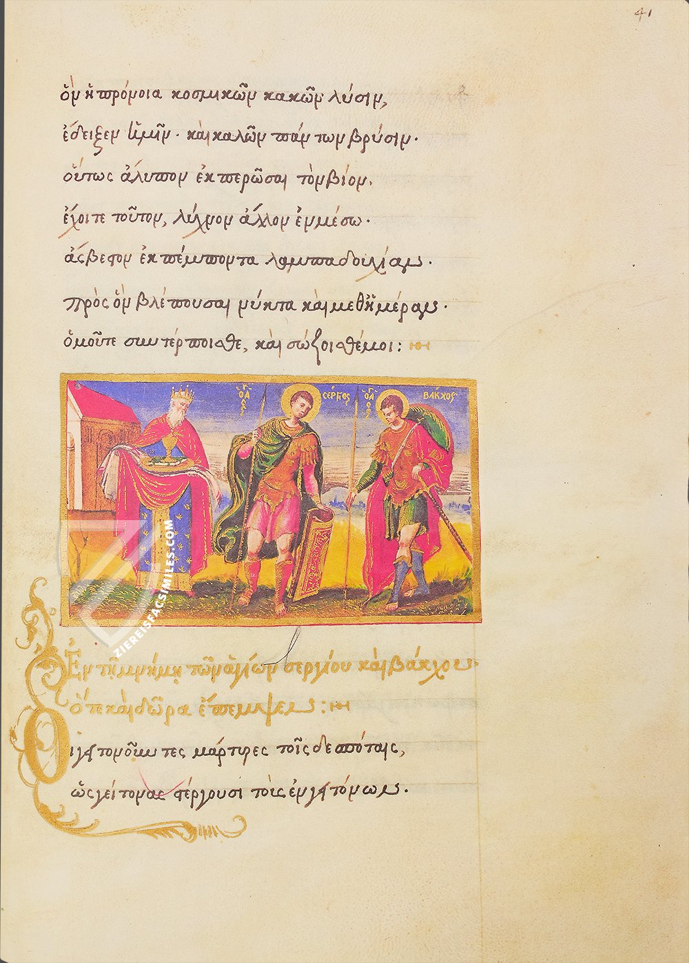 The artist of the manuscript, the copy of the 11th century original, was Nicolas de la Torre, the favorite miniaturist of King Philip II. He furnished John of Euchaitaβs text with gorgeous initials, which always reach beyond the margins and into the script. They are embellished with artful golden ornaments, these pass over the entire length of the pages as decorative bordures and offers the full splendor of the Renaissance to the eye of the beholder. Square-framed miniatures are always to be found in suitable places in the text. These gorgeous, exceedingly high-quality paintings stand out through their opulent colorfulness and their fine, gilded ornaments. The outstanding miniaturist clearly oriented himself stylistically on Byzantine painting, but allows clear influences from his time period, the Renaissance, to be recognized. The marvelous scenes, which vividly illustrate the 11th century Greek text, arose in this way and make the manuscript a true treasure of illumination and literature.