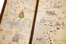 The first two sheets consist of tables and diagrams for calculating the tides, moveable feast days, and a diagram of the so-called Zodiac Man (first sheet) as well as a lunisolar calendar for calculating the phases of the Moon throughout the year with zodiac signs, accompanying texts and representations of the four seasons in the corners (second sheet). Beginning in the West, sheets three through six contain four maps spanning from 10° to 60° north latitude and between 20° west and 120° east longitude, thus the Southern Hemisphere is omitted. As the maps move eastward, the lack of geographical information is compensated for by rich ornamentation that simultaneously fills the empty space and fueled the curiosity of the people of medieval Europe towards the wide and fabled lands of the East. This includes miniatures depicting Kublai Kahn, the creation of man, Gog and Magog, Alexander the Great, and even the Antichrist.