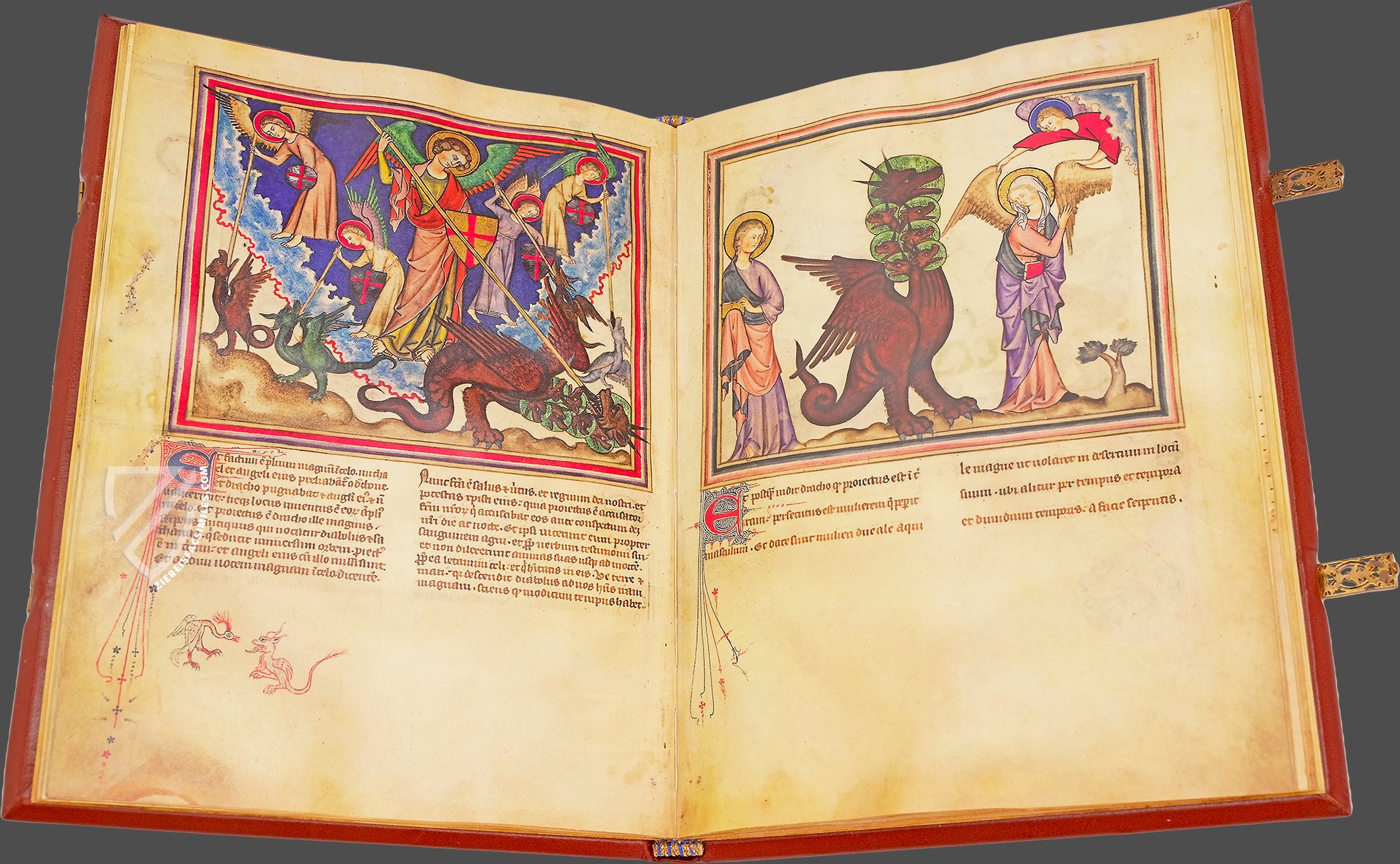 72 miniatures, including 4 full-page miniatures divided into two registers, gorgeously illustrate the events of the Book of Revelation. The full pages depict scenes from the life of Christ beginning with the Annunciation and ending with the Flight to Egypt and it is these introductory images full of pleasant scenes of domesticity that set the tone for the rest of the work. While the image program is very similar to the Lambeth Apocalypse, which originated ca. 50 years previously, the atmosphere in which the events are presented is totally different. Events in the Lambeth Apocalypse are terrifying: faces are contorted in horror, bodies are deformed and twisted in physical and psychological pain, and menacing monsters roar. The Cloisters Apocalypse, on the other hand, bears a closer resemblance to a contemporary bestiary and presents the events as though they were a natural part of history; even the grotesques and monsters appear more comical than terrifying.