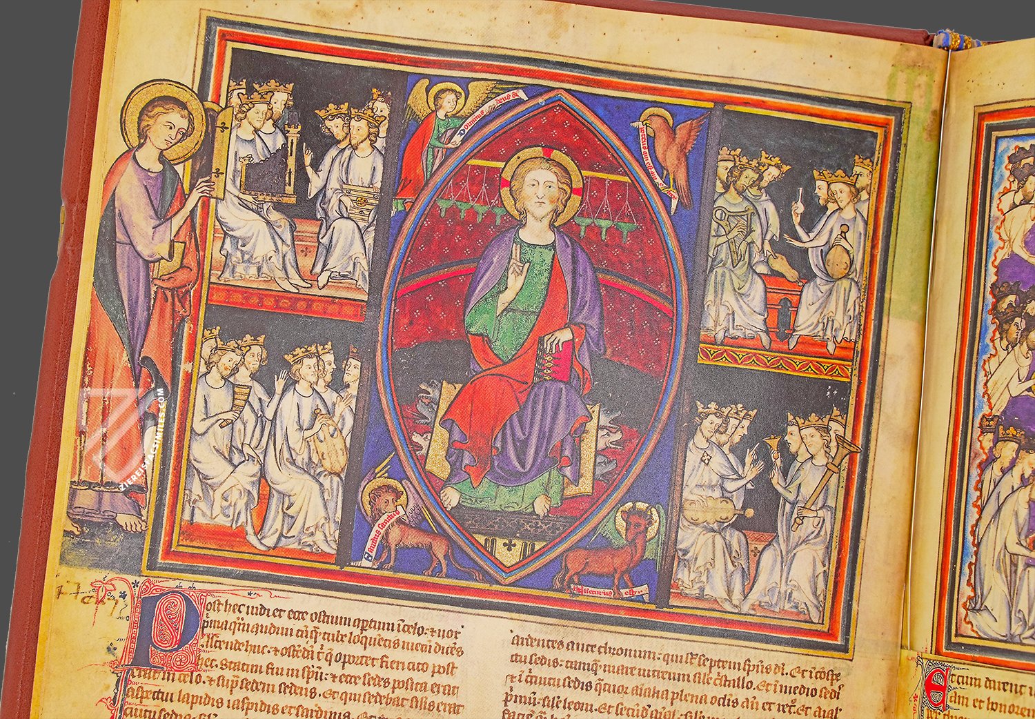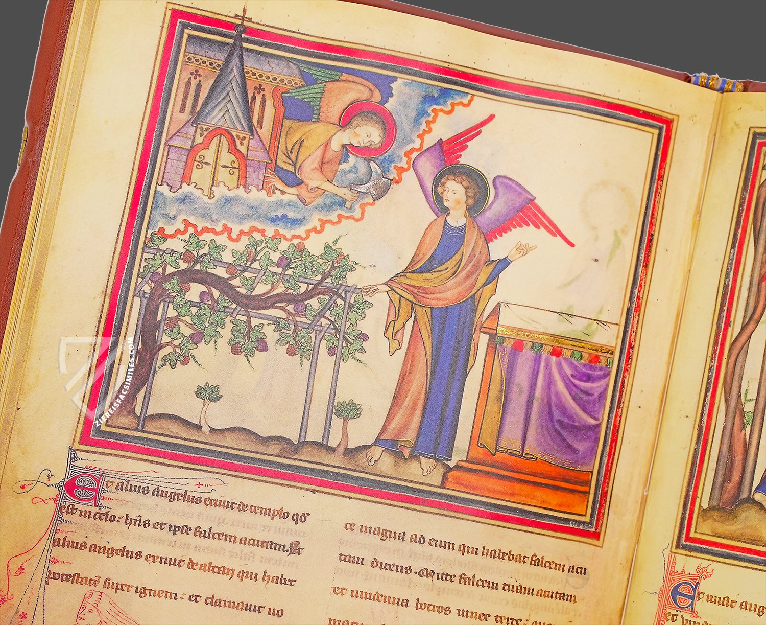 This is written on the scroll that an angel holds out to the sleeping John. The first miniature of the text of Revelation, which follows the picture cycle on the childhood of Jesus, shows the commissioning of John on Patmos. After hearing a "great voice as of a trumpet", his apocalyptic vision appears to him, which he is to write down in order to send it to the seven biblical communities of Ephesus, Smyrna, Pergamos, Thyatira, Sardis, Philadelphia and Laodicea.