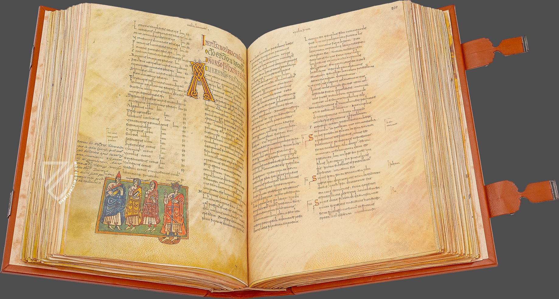 The Codex Albeldense, stored in the famous collection of the El Escorial, is counted among the most important historical Spanish sources from the 10th century. Created in the Monastery of San Martín de Albelda in the region of Rioja, the miscellany contains various legal texts and a Christian vita of the Prophet Muhammad, as well as a comprehensive chronicle of the Kingdom of Asturias under King Alfosno III. This chronicle, composed at the Asturian royal court at the end of the 9th century, is an inestimably valuable source of knowledge about the Visigothic, Asturian, and Galician kingdoms. In the gorgeous Codex Albeldense, one of four surviving specimens of the chronicle, these informative explanations illustrate cityscapes, portraits of important historical figures, and an additional 82 miniatures in the most wonderful way. A marvelous testimony to Spanish history!