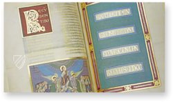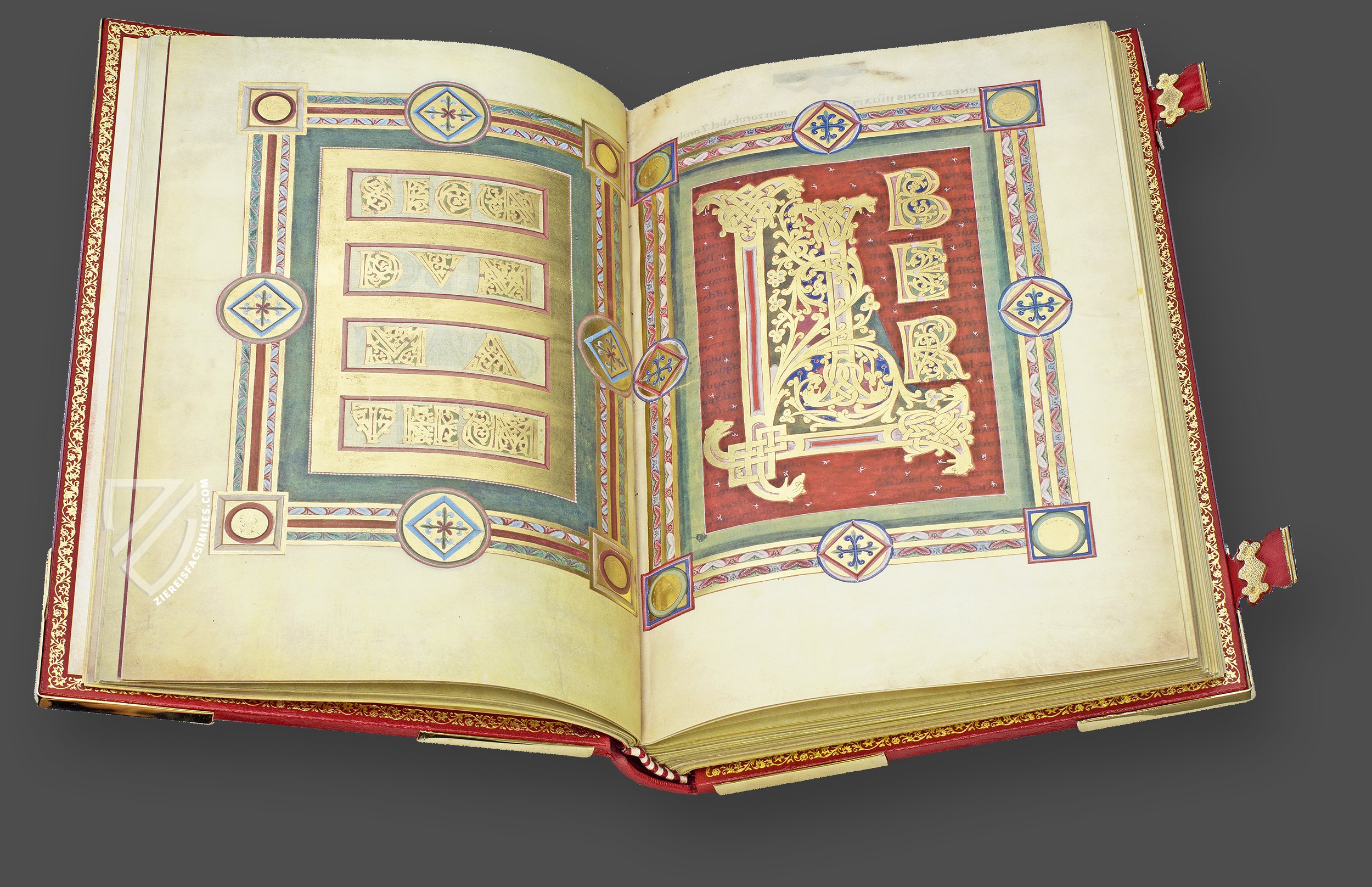 - 13 full-page and 43 half-page miniatures, 12 canon tables with classical arcades, 44 decorative pages with incipits and large initials, colorful gold leaf frames