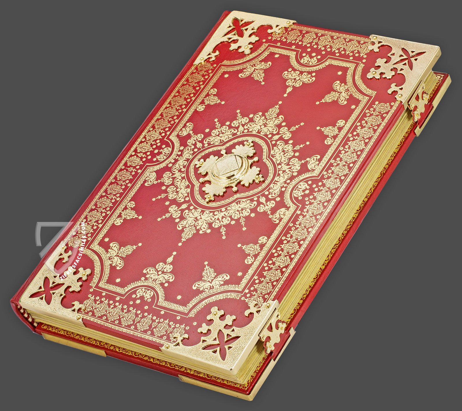 The visual décor of the splendid Ottonian manuscript follows a strict numerical symbolism based on the divine order. Alongside the golden text of the codex, the visual adornment of the document is comprised of thoroughly high-quality illumination. The splendid dedication picture is only an example of this outstanding quality: the Emperor Henry III and his wife Agnes kneel in silent prayer on either side on an enthroned Virgin Mary in the center of the splendid architectural backdrop of the Speyer Cathedral, which had not yet been finished at the time of the codex’s completion! The manuscript came into the possession of Margaret of Austria by way of Maximilian I, then Mary of Hungary, and finally came to Spain through King Philip II. Today, the Codex Aureus Escorialensis is counted among the greatest treasures of the El Escorial Library.
