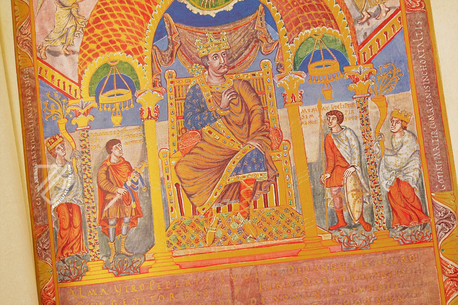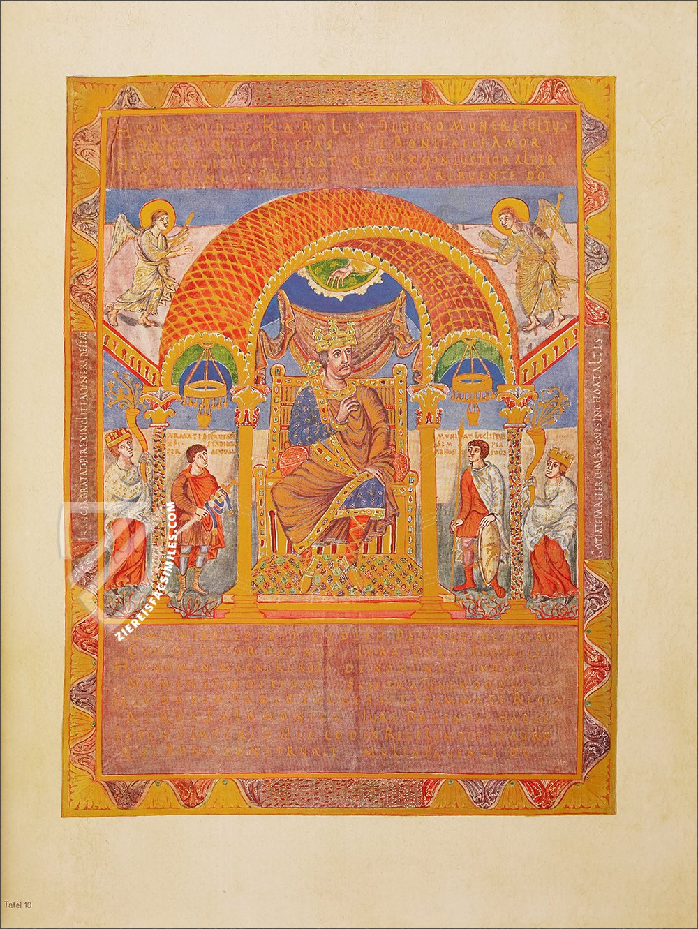 Holy Roman Emperor Charles II is depicted enthroned between two arms-bearers and female personifications of the lands of Francia and Gothia, which is modern day southern France. He is richly dressed in colorful robes trimmed with gemstones. His divine right to rule is represented by a hand reaching down from the heavens, where two angels look down approvingly upon Charles. This miniature served as a template for a similar portrait of Emperor Henry II in his splendid 11th century sacramentary.