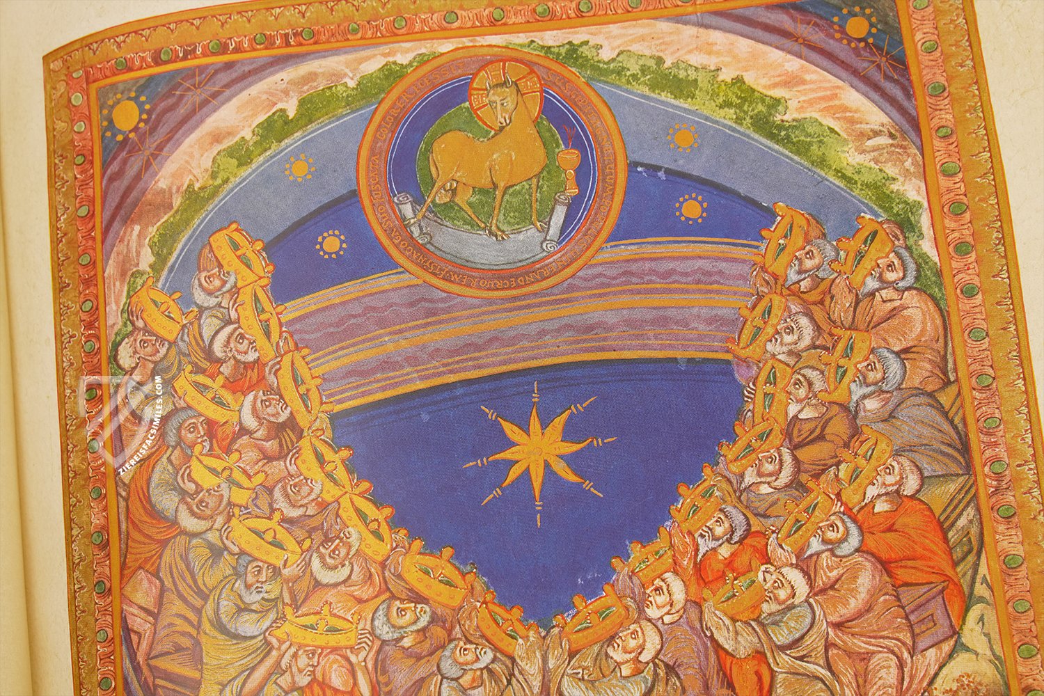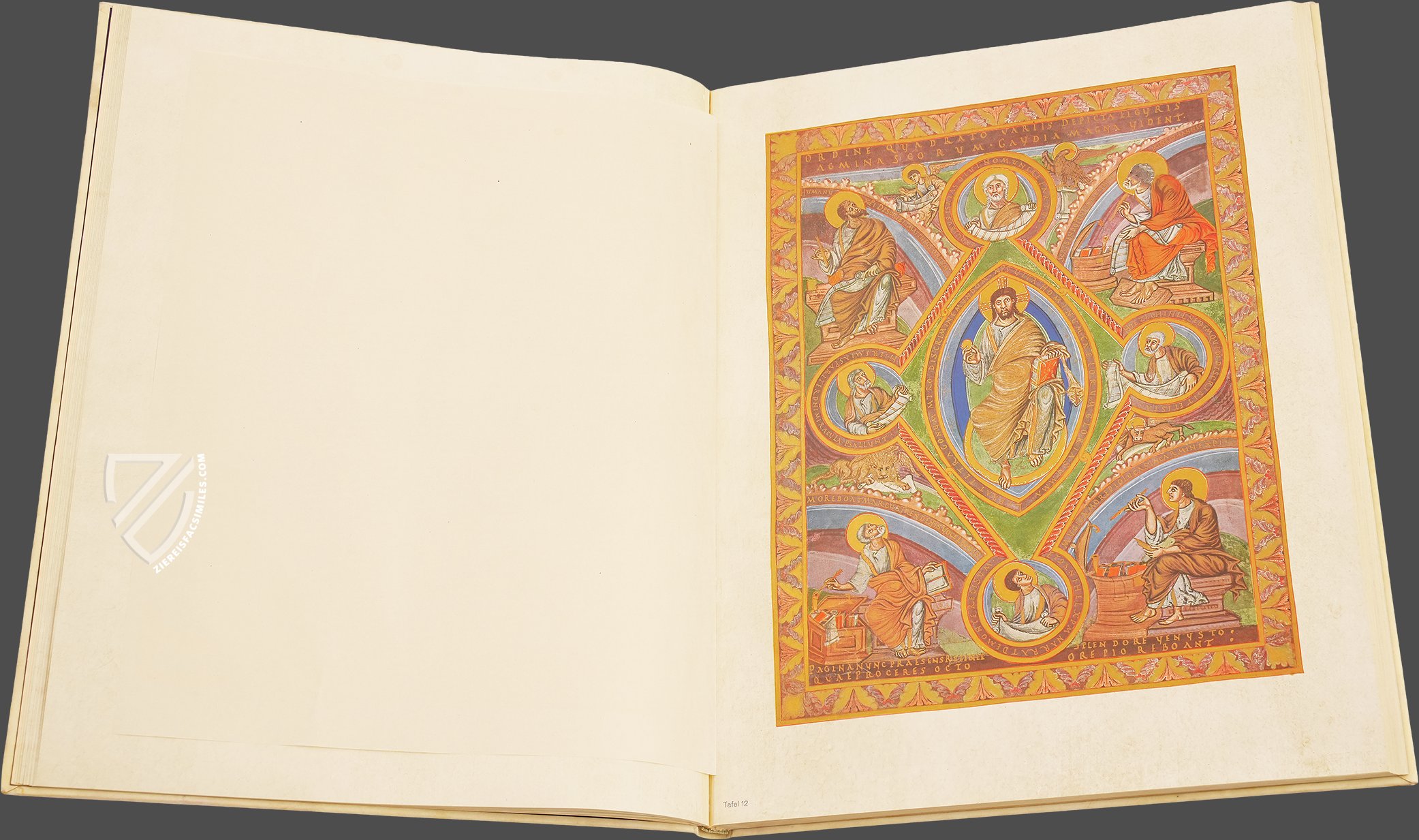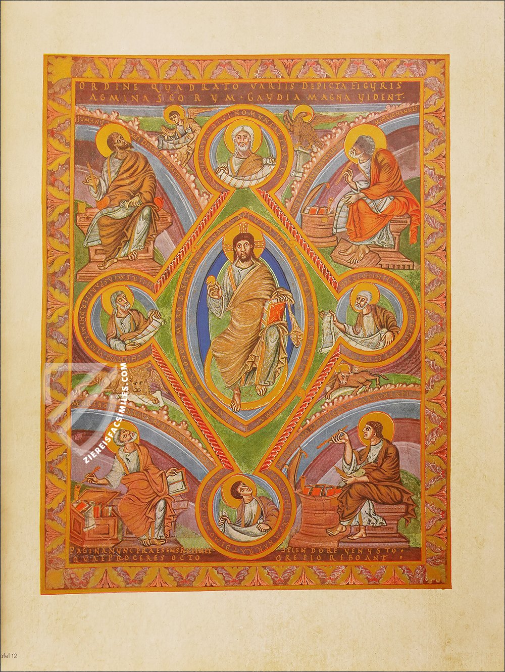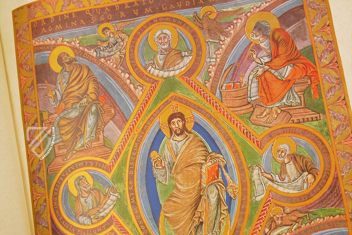 Christ sits in a central mandorla (an almond-shaped aureola) while holding a book in one hand and a golden globe in the other as he looks directly at the beholder. The four major prophets β Jeremiah, Isaiah, Daniel, and Ezekiel β are depicted in medallions holding scrolls. Meanwhile, the Four Evangelists sit in the corners working on their respective Gospels and looking at their symbols for divine inspiration.