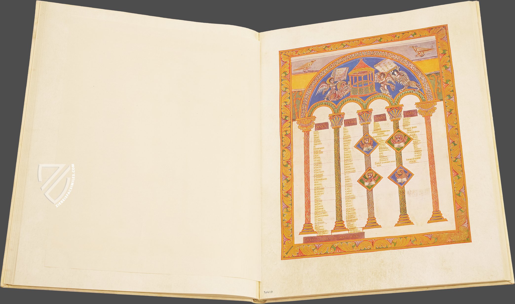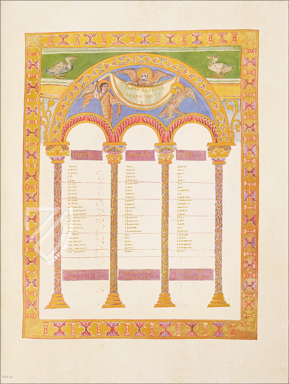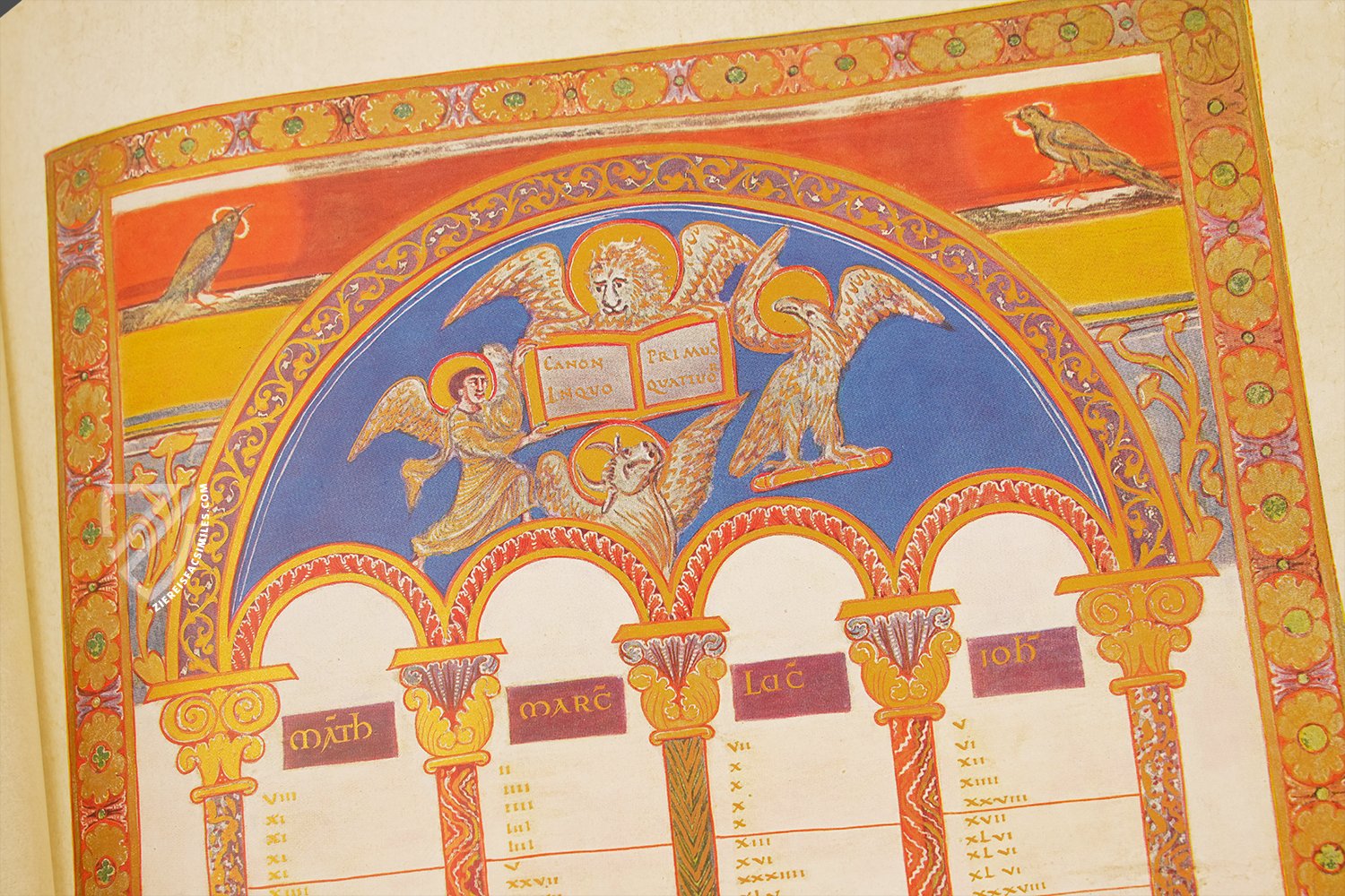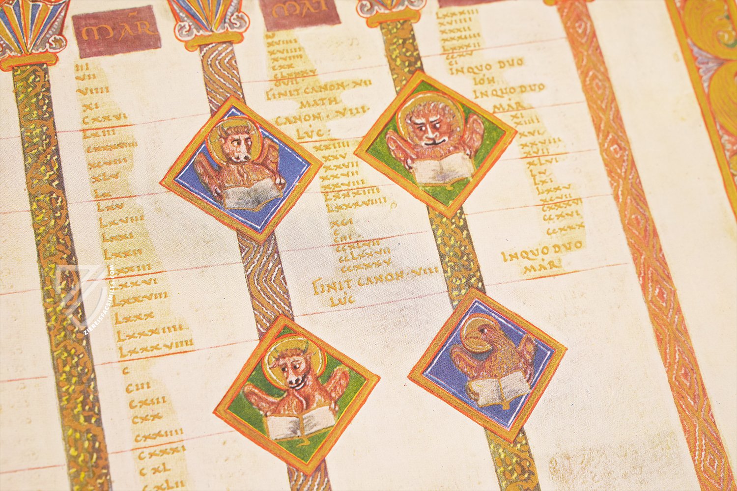 - 16 ornamental pages, 12 of them with large miniatures and expansive ornamental frame program, the remaining 4 are ornamental incipit pages; 12 canon tables; each text page has an ornamental frame; the original treasure binding is preserved