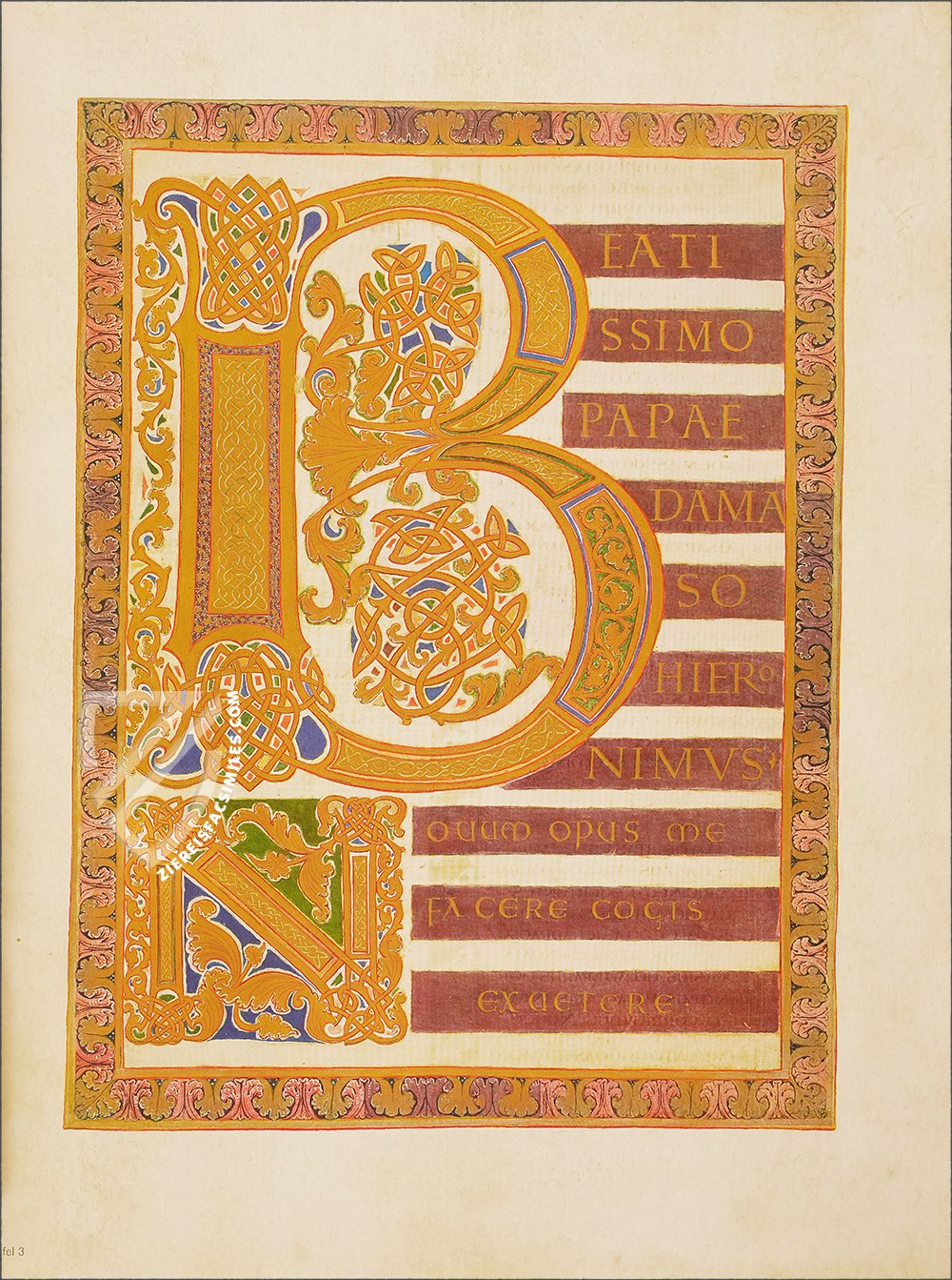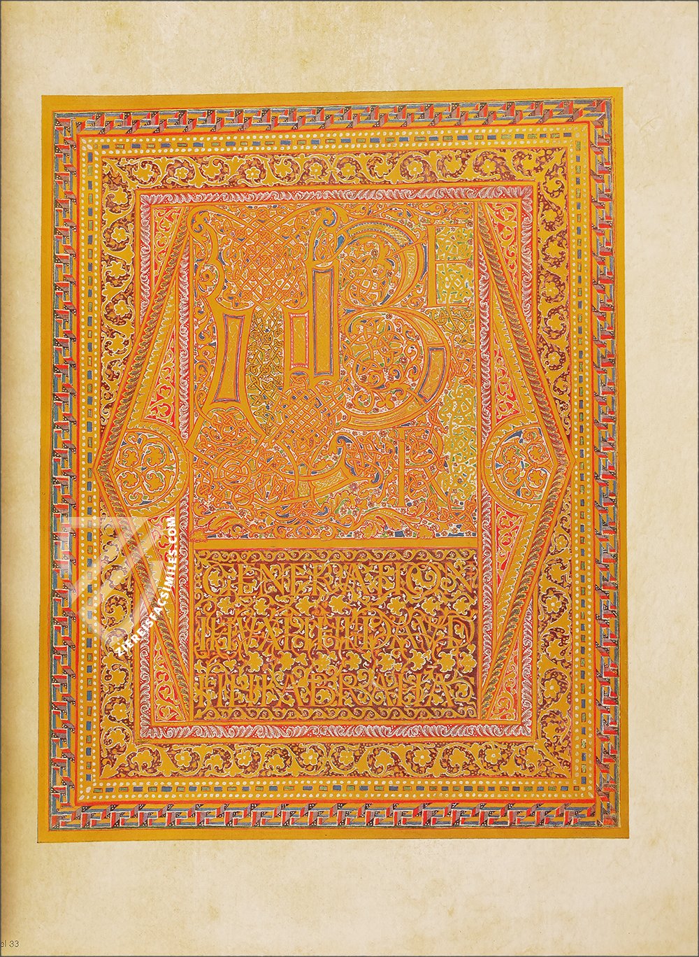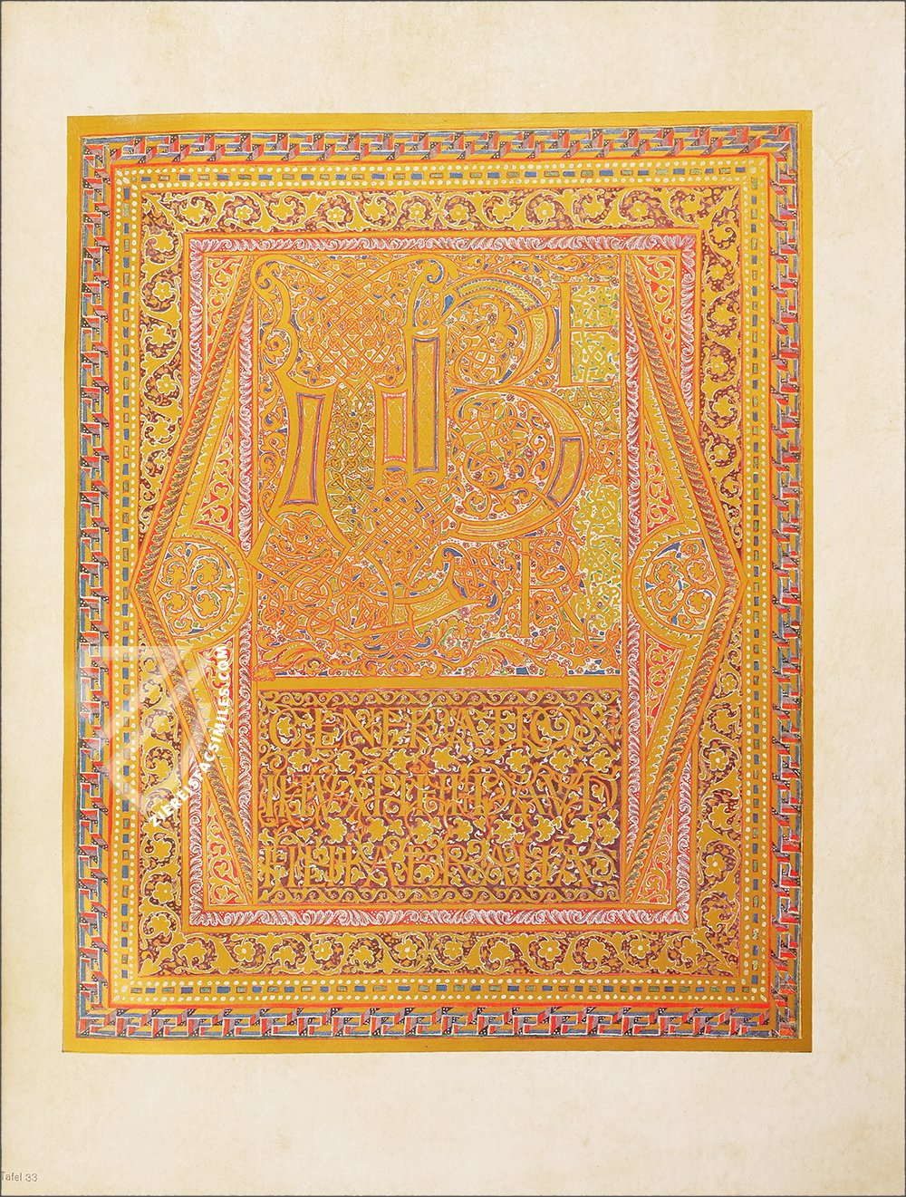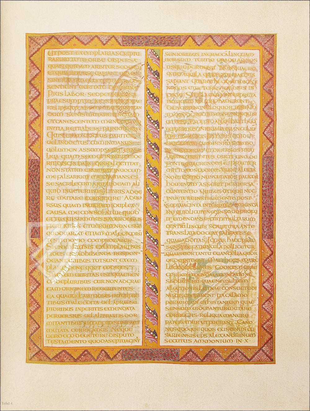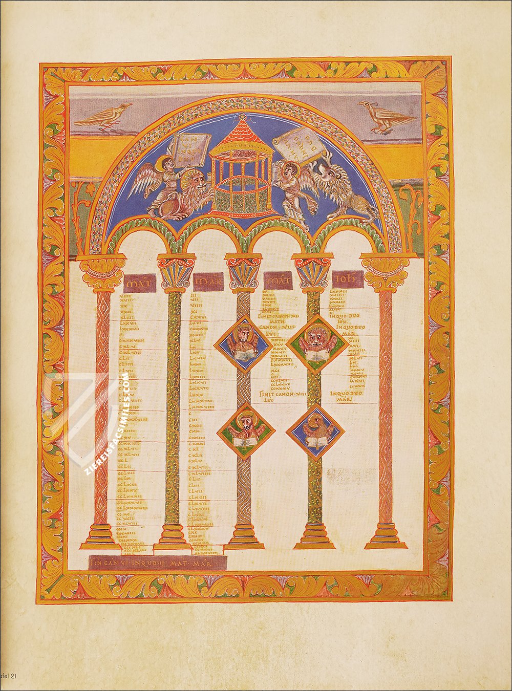 - 16 ornamental pages, 12 of them with large miniatures and expansive ornamental frame program, the remaining 4 are ornamental incipit pages; 12 canon tables; each text page has an ornamental frame; the original treasure binding is preserved
