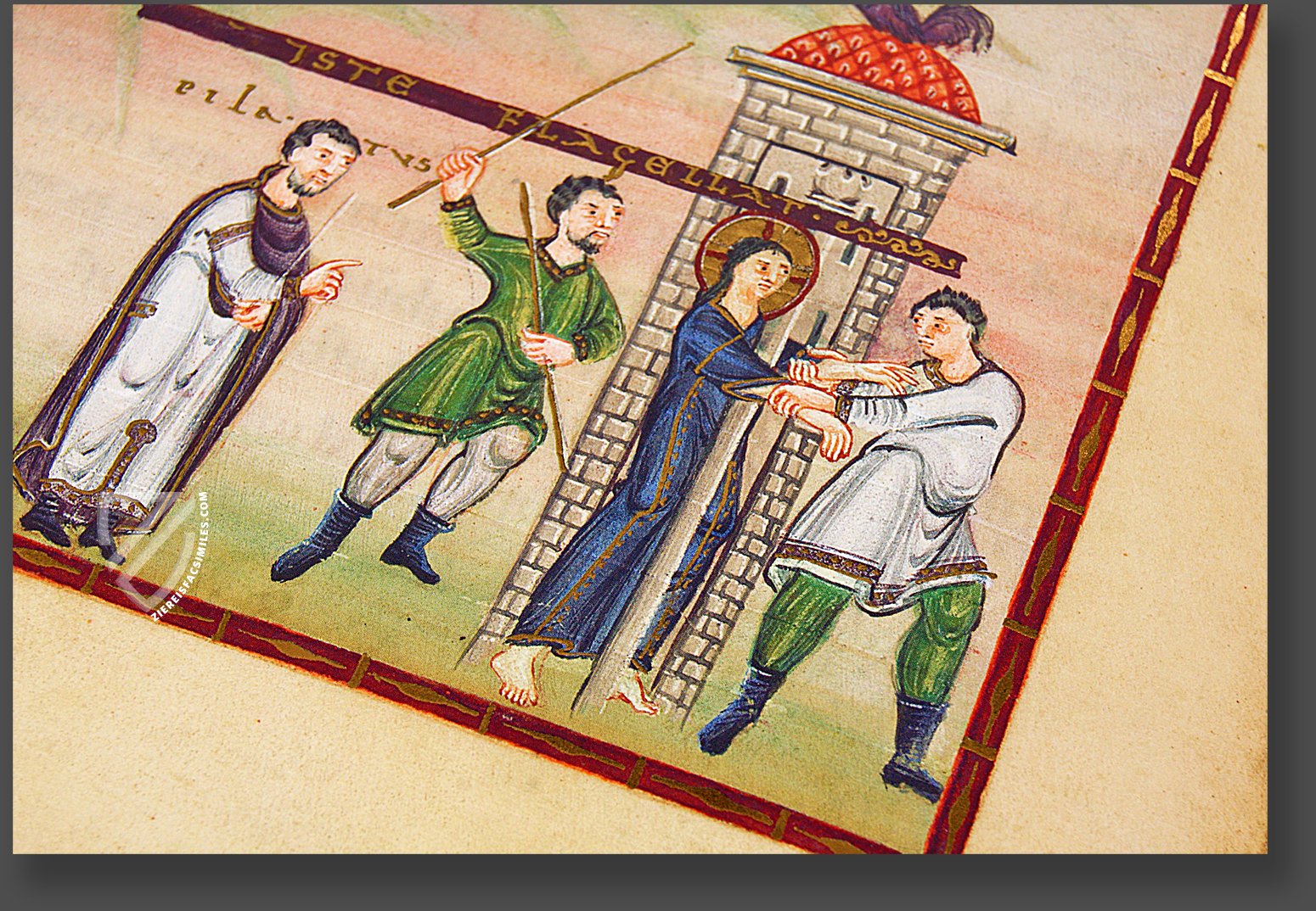 Archbishop Egbert von Trier, is considered by historians to be a one of the greatest lovers and collectors of books during the second half of the 10th century. The great patron of scholarship and art worked with the Reichenau Monastery, which was one of the most important centers of European art at that time. Egbert’s trusted scribe and illuminator was the Master of the Restrum Gregorii, the Gregory Master, who lived in the scriptorium of the Abbey of Trier and carried on correspondence with contemporary illuminators. The master’s art is strongly influenced by Insular and Byzantine Illumination. His knowledge and talents are displayed in the seven miniatures of the codex that he personally created himself. The remaining miniatures were completed by the monks Kerald and Heribert of Reichenau. Both of the gifted painters closely adhered to the pictorial program worked out by the Gregory Master, so that the miniatures of the Egbert codex tell the tale of the life of Christ in interrelated pictures.