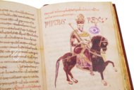 Mounted on a dark steed, the first Carolingian to become King of the Franks is dressed in a bejeweled purple toga and depicted with a purple beard, crown, and scepter under the caption PIPINVS REX. It is a fitting portrait for such an ambitious man, one of the most powerful rulers of his time, but who is overshadowed by his magnificent son, Charlemagne. Aside from driving the Moors from Septimania in southern France, his greatest accomplishment was extending Frankish rule into Italy at the expense of the Lombards and helping to establish the Papal States.