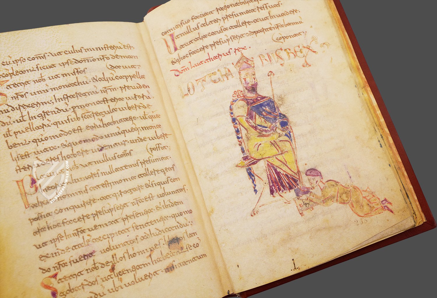 Emperor Louis is richly dressed in colorful bejeweled robes, the lining of which has a different color, and his stockings have an elaborate interlace pattern. The bare-legged figure standing to his left holds an open book and points to the word Lex, indicating that the Emperor is consulting with an adviser concerning a legal matter. Louisβ beard is painted purple, his eyebrows red, and the cheeks of both figures have been painted red as well.