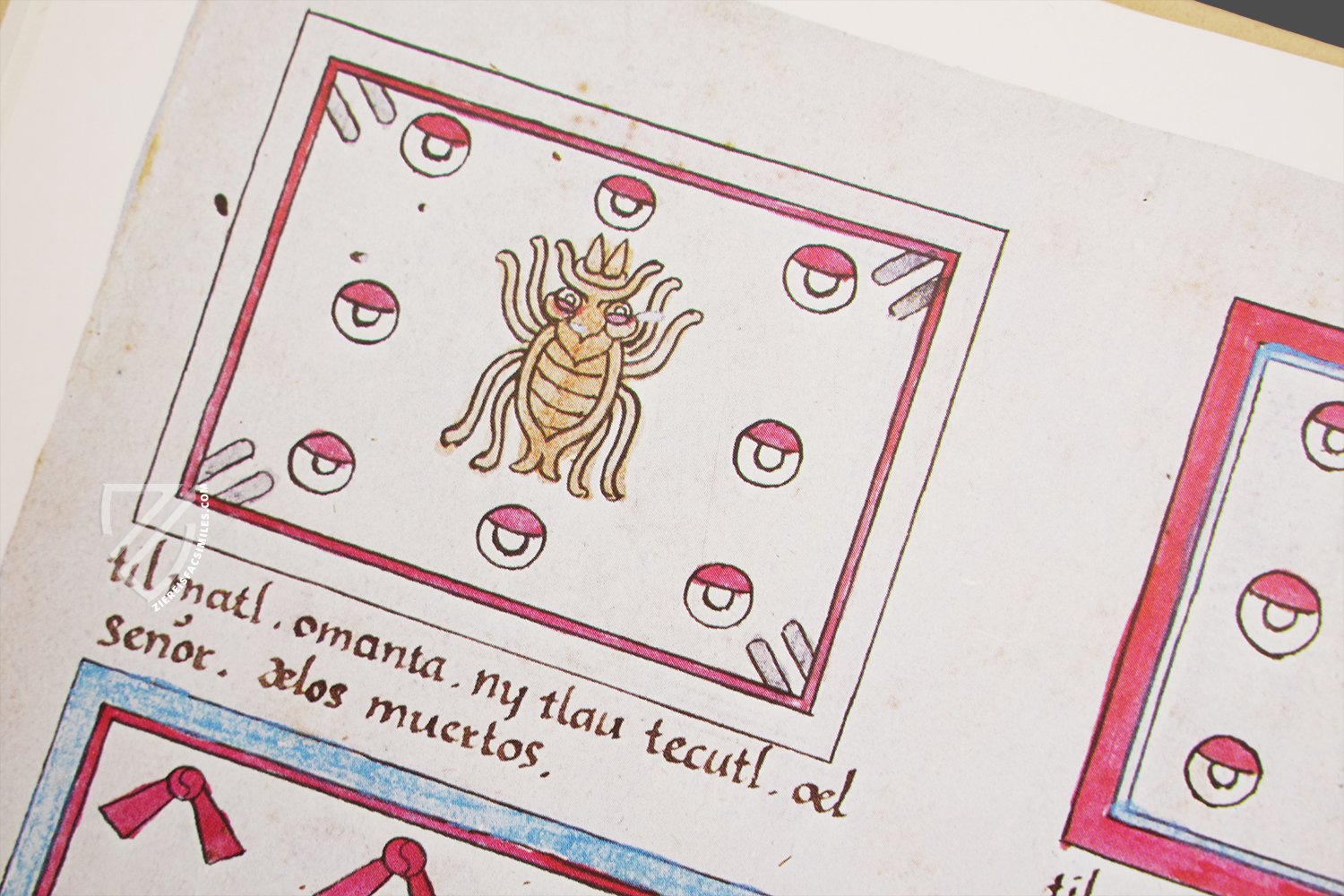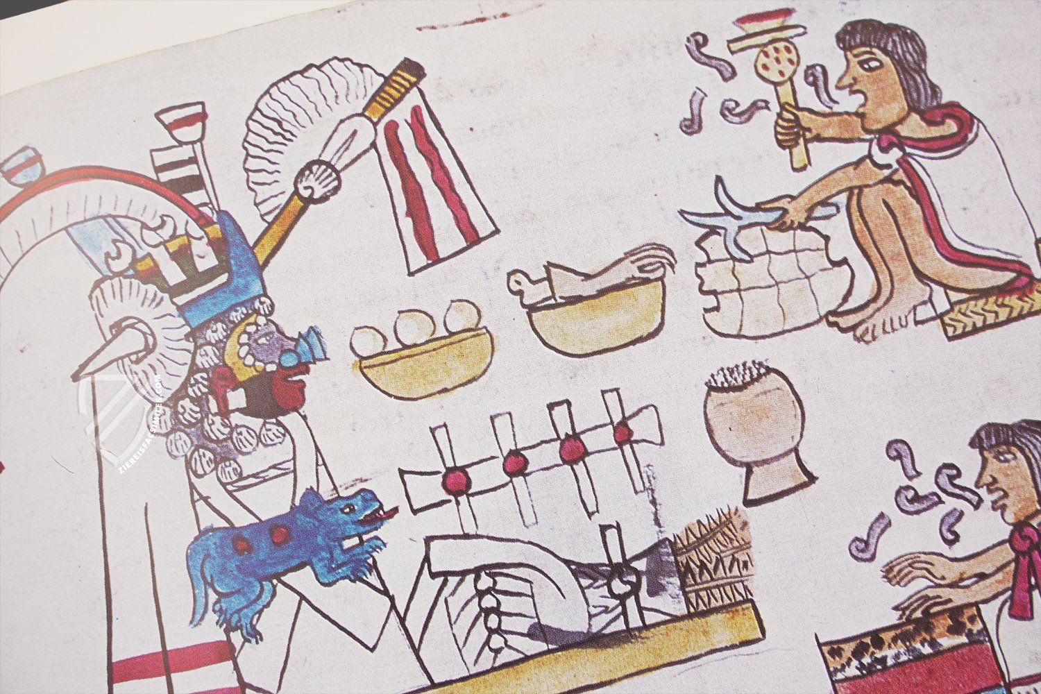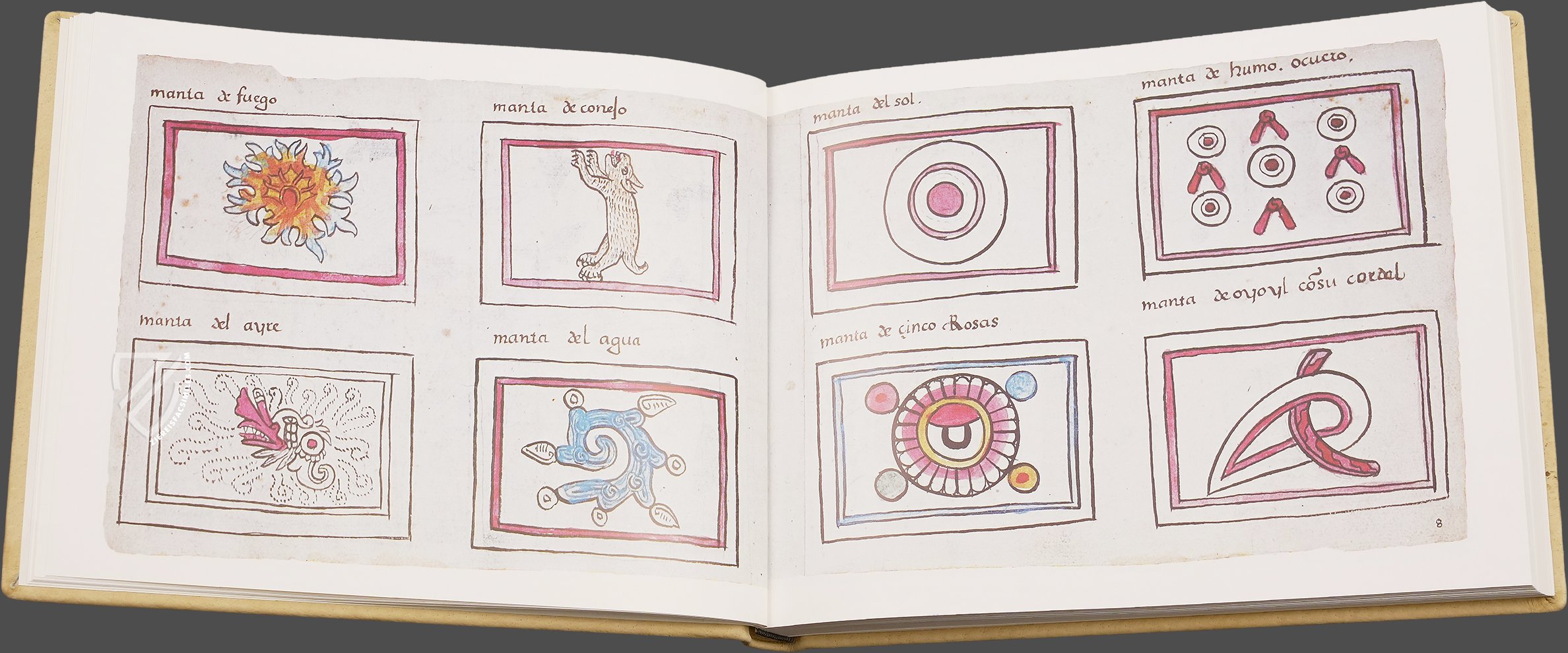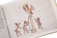 This codex from the library of Antonio de Marco Magliabechi (1633-1714) belongs to a series of post-Columbian Mexican illuminated manuscripts from around the middle of the 16th century. Painted on European paper, reproductions of calendrical-religious knowledge appear in the characteristic broken style of the early colonial period. The great value of the manuscript lies in its detailed Spanish explanations. The presentation of the patterns of cloaks worn in ceremonies is followed by the indication of the 20 day signs and a calendar cycle of 52 years. This is followed by the series of monthly festivals. The gods of the pulque, the dead, the mountains, and the rain are described in particular detail, as are the rituals of the feasts for the dead and the healing of the sick. Finally, the depiction of the four deities whose costumes formed part of the Mexican gift to CortΓ©s in 1519 deserves mention.