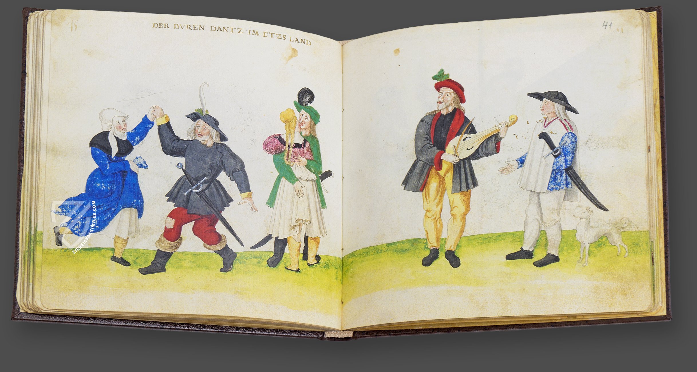 The 125 miniatures of this manuscript are a parade of Portuguese, Berbers, Indians, French, English, Turks, Tatars, Irish , Croats, and Hungarians, and also feature more detailed depictions of the peoples of Germany, Spain, and the Netherlands. Although it is not known who created the manuscript, the influence of various Northern Renaissance masters can be seen in this work such as Albrecht Dürer (1471–1528), especially with regard the dress of Nuremburg, Livonia, or among the Turks, as well as Albrecht Altdorfer (ca. 1480–1538) and Hans Burgkmair the Elder (1473–1531). Furthermore, there is evidence of the influence of the anonymous workshop on contemporary masters like Lucas Cranach the Elder (1472–1553), particularly in the miniature showing the emperor and seven prince-electors, or Lucas de Heere (1534–1584), whose image of a lancer on horseback from ca. 1570 is faithfully recreated from the opening page of the Codex of Costumes. Then again, both could be copies based on the same model. Georg Hoefnagel (1542–1601) also produced horse riders very similar to those in this manuscript for his famous Civitates Orbis Terrarum. Numerous other artists were influenced by the work including Jost Amman (1539–91) and Cesare Vecellio (ca. 1521 – ca. 1601).