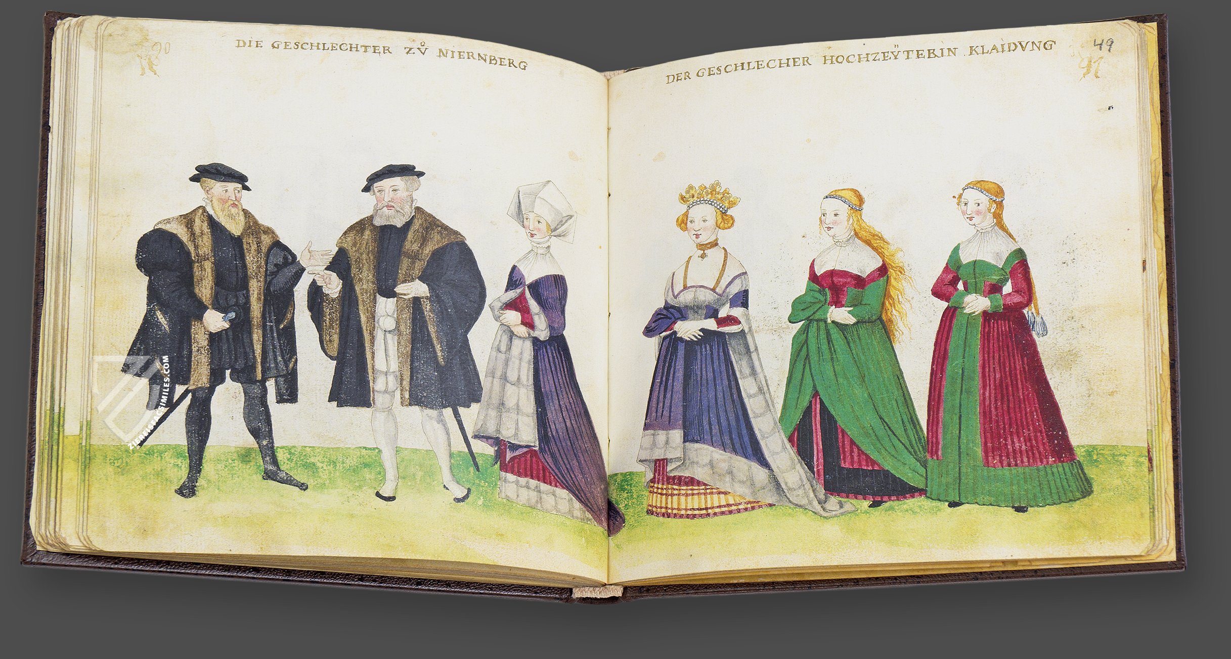 The Biblioteca Nacional de España has a significant German manuscript from the 16th century in its collection: the Códice de Trajes or “Codex of Costumes”. It was acquired by the Ministry of Culture from a private collection in December of 2010, and contains a repertoire of 125 illustrations of clothing using gouache watercolors. It depicts the manner of dress in Spain, some neighboring countries around the empire of Holy Roman Emperor Charles V (1500–58), and more faraway places such America and Africa. It has epigraphs in German and was made in an unknown artist’s workshop. Its great rarity and importance as a source of knowledge regarding the costumes and fashion at the time, as well as the charming beauty of its illustrations, make it an exceptional work.