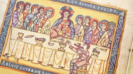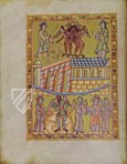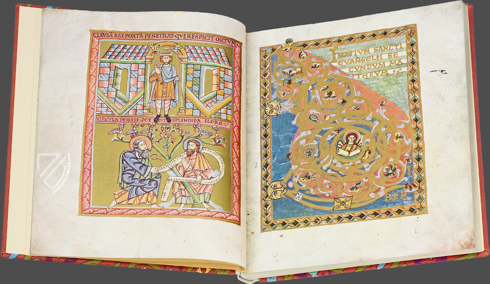 The exceptional Romanesque illumination makes it one of the finest illuminated manuscripts from the second half of the 11th century and shows influences from Ottonian art, the Regensburg school in particular, and it is believed that the artists were foreigners who were invited to collaborate on a royal masterpiece. More than 60 miniatures adorn the Biblical texts in addition to elaborate initials and gorgeous frames. The four-page genealogy of Christ is both extremely artful and unusual in its depiction of the Tree of Jesse: instead of Christ’s ancestors, seven doves with halos perch in the branches, a motif from Byzantine art. Gold leaf has been used generously throughout the manuscript and contrasts wonderfully with the unusual, almost pastel color palette with unusual shades. Finally, the gorgeous text is written in an innovative mix of Roman capitals and uncial script.