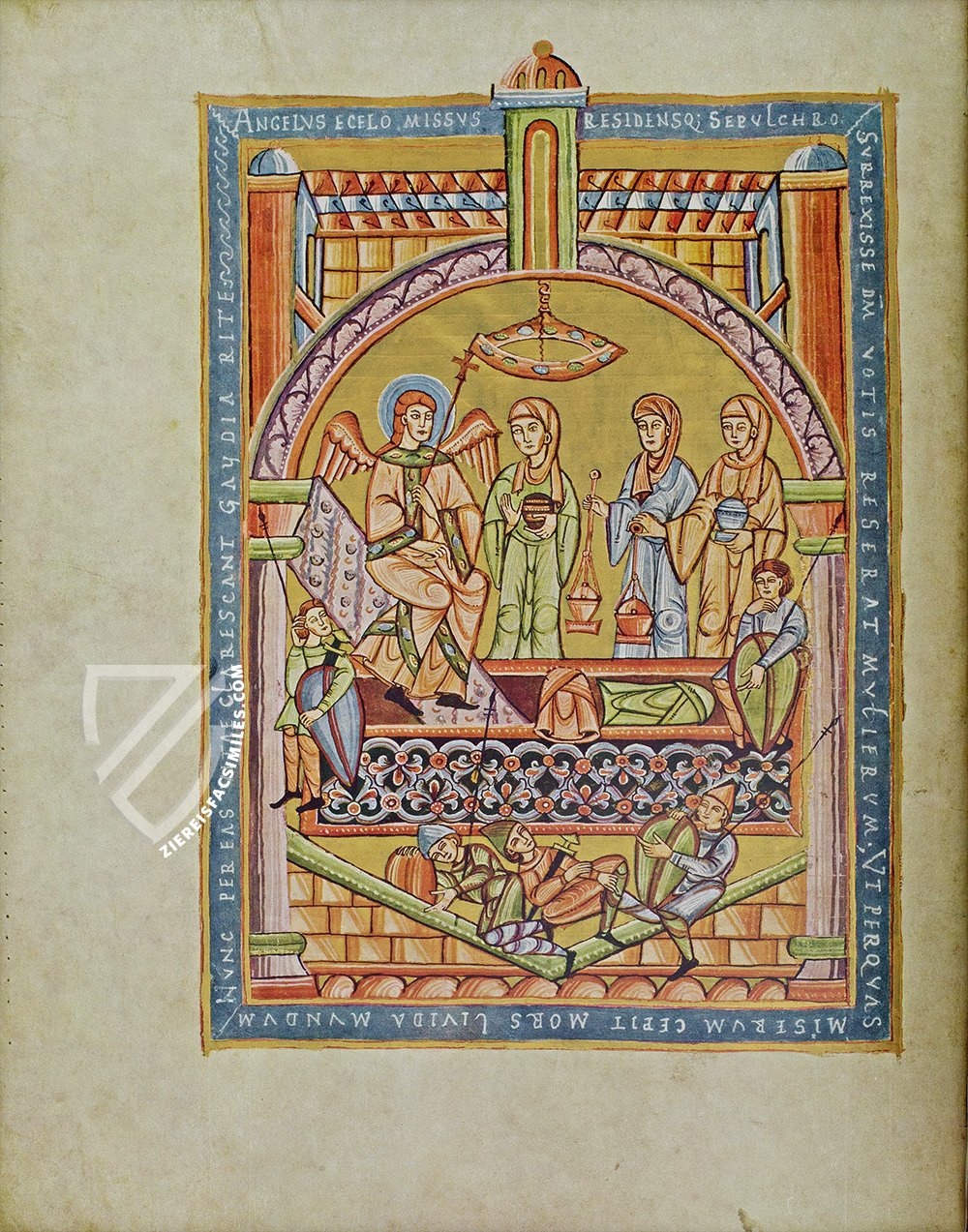 The angel is depicted in a splendid robe trimmed with colorful gemstones and holding a cross-staff as he greets the Three Marys, who hold censers and jars of incense. Christ’s tomb is an elaborate sarcophagus with an intricate floral interlace pattern and is empty save for his discarded burial shroud. The soldiers guarding the tomb are small and childlike symbolizing their powerlessness in the face of an angel.