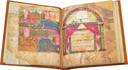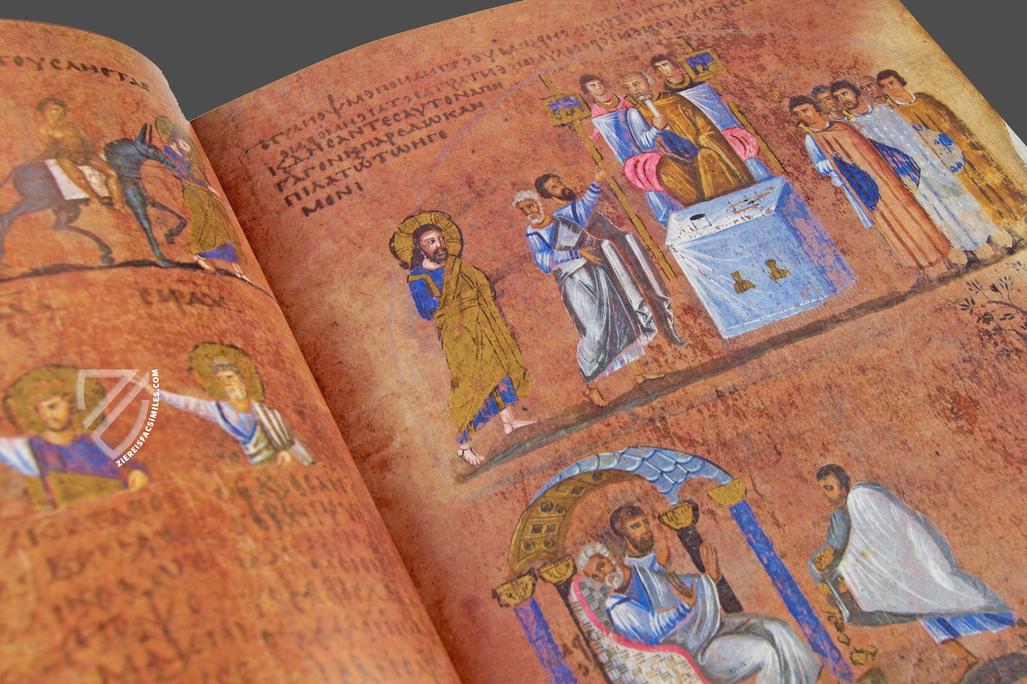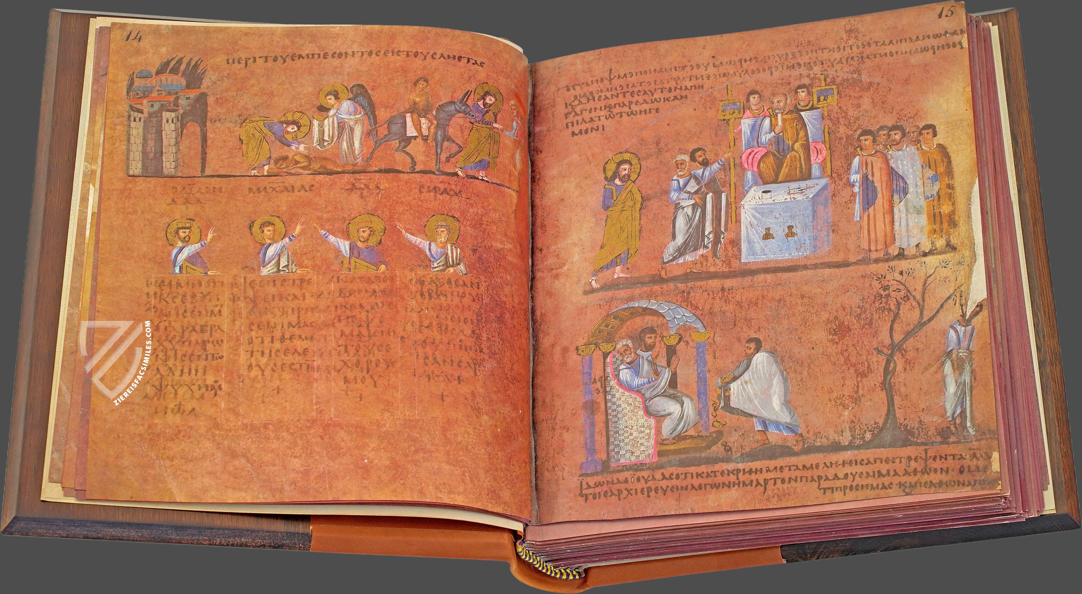 The significance of this book is further strengthened by the fact that only a few of the purple parchment codices created during the Late Classic Period were illustrated with miniatures. Some of the luxurious miniatures painted by the most talented artists of the time cover entire pages while others are set above or between flowing text creating a frieze-like style. Both theme and presentation style are based on earlier models, most likely monumental wall paintings. The miniatures are said to be the finest examples of early Byzantine art preserved to this day.