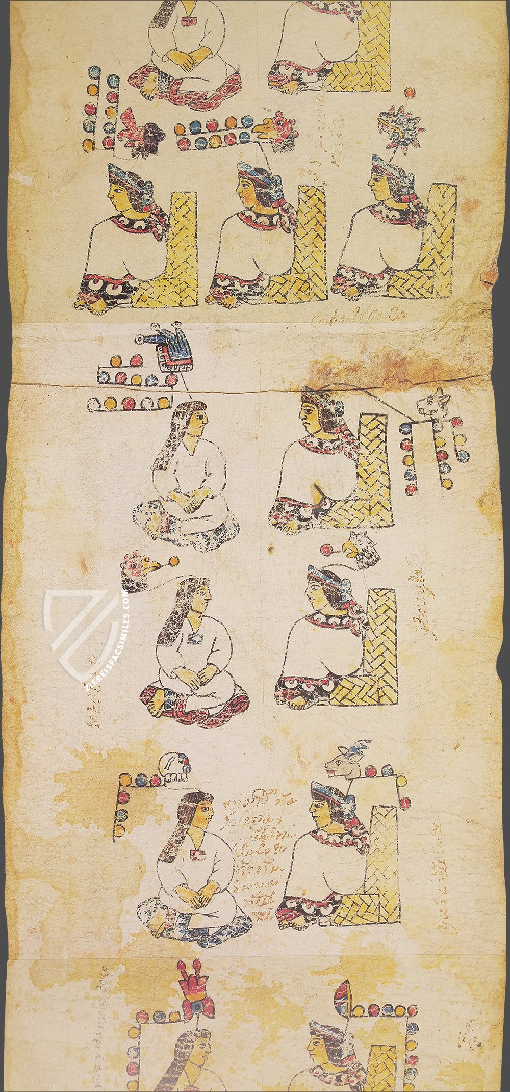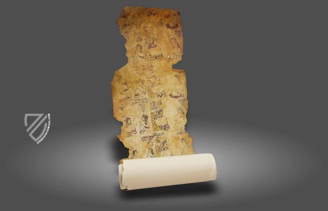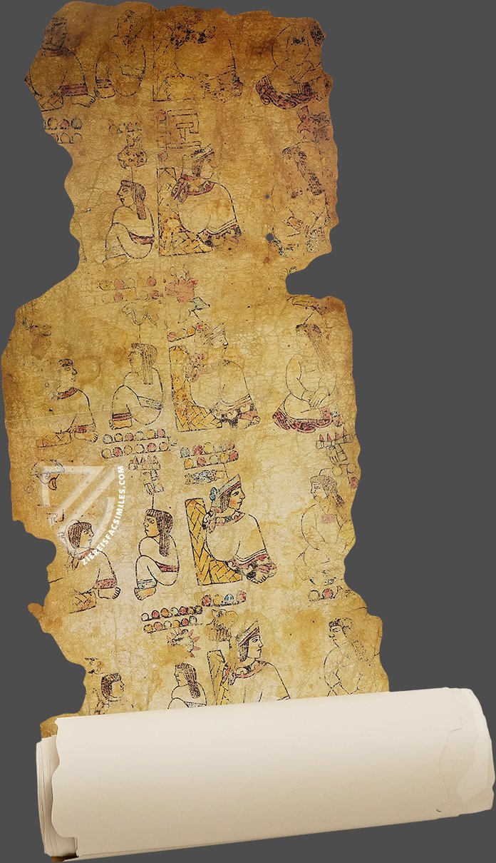 A precious document from the realm of the Mixtecs, a neighboring advanced civilization of the Aztecs. Their territory was located between the capital of the Aztec empire Tenochtitlan (on the territory of today's Mexico City) and the present state of Oaxaca, about 460 km southeast of Mexico City. The richly illustrated Codex Tulane quickly makes the differences to the Aztec Empire clear: in their territory, the Mixtecs produced very artistic pottery in characteristically bright, often turquoise shades. The Codex Tulane is nearly 4 meters long when unrolled and contains not only a mythological origin scene, but also the genealogy of two dynasties from Acatlán and Chila over 15 generations of rulers. This deerskin manuscript is the only written source on the Puebla region south of Mexico City. Thus, today it represents the most valuable treasure of Tulane University in New Orleans.