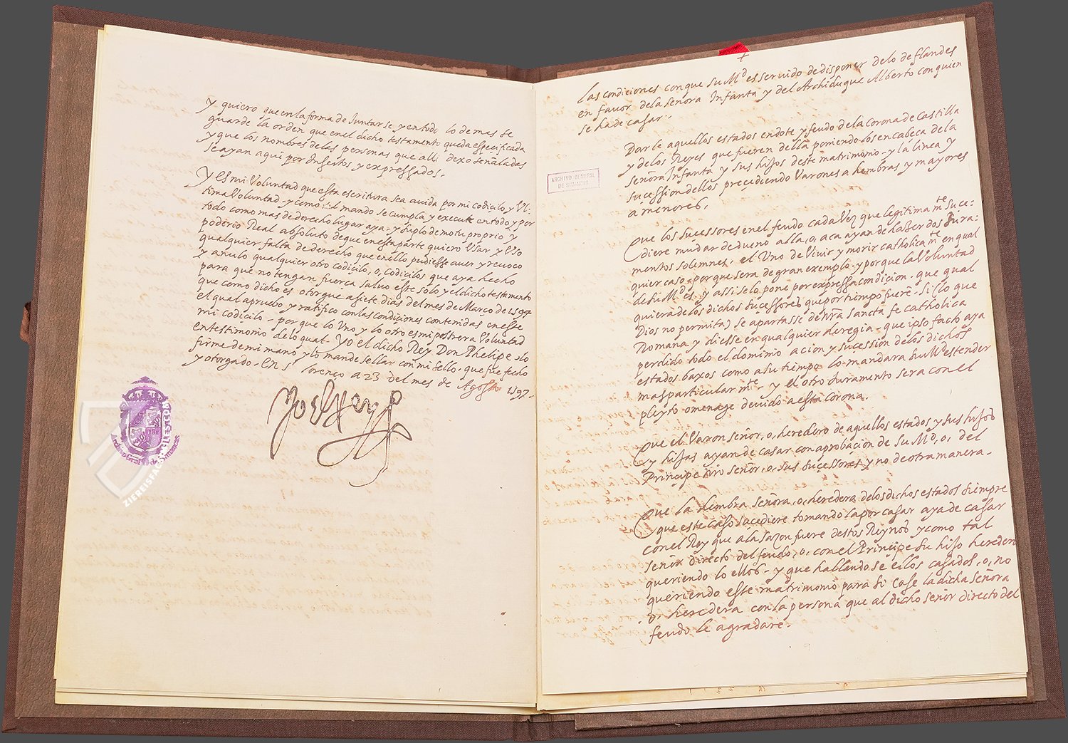 This treasure has been housed up to this day in the Archivo General in Simancas. The last will and testament of the Spanish King is 74 pages, legitimized by a signature from his own hand. Philip II laid out 49 clauses or matters that pertained to him as a private person, but also in his position as the sovereign of the Spanish Empire. After the typical stipulations for the repayment of debts and donations, the profession of faith, and the burial arrangements, the focus of these official and simultaneously intimate documents lies in the maintenance of his progeny the division of his legacy.