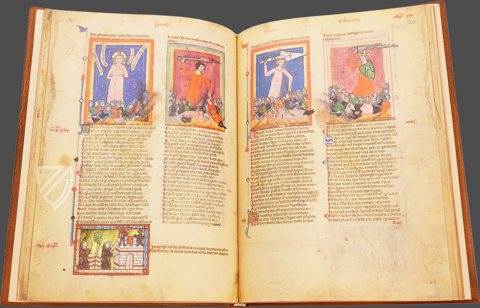 In this unique Mirror of Human Salvation, which was created in Avignon around 1340 by four book artists, the Christian salvation story is linked to the life of St. Francis of Assisi (1181/82β1226). The Italian saint and founder of the order of the Franciscans, who lived according to the ideal of Jesus, is portrayed as a follower of Christ in 49 gold-decorated miniatures, in which scenes from his life are set in analogy to depictions from the life of Jesus. This is absolutely extraordinary among the many surviving copies of the Speculum humanae salvationis, which was a bestseller of the Middle Ages and explains the divine plan of salvation for laypeople. This is illustrated in a further 178 column-wide miniatures that visualize stories from the Old and New Testaments. Executed in the French Gothic style, they stand out in bright colors and gleaming gold leaf. The remarkable, decidedly Franciscan decoration of the manuscript makes it one of the most interesting and at the same time most artistic copies of the Speculum humanae salvationis.
