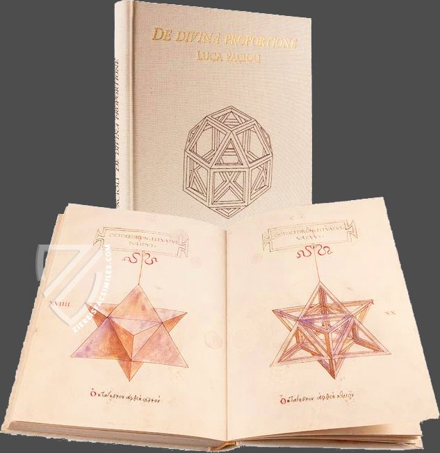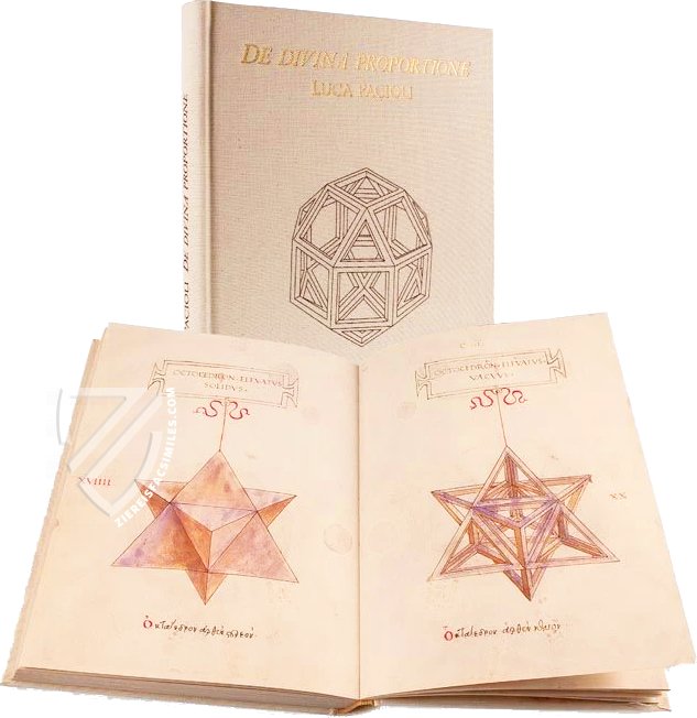 This gorgeous manuscript of the famous treatise about the golden ratio is a precious testimonial to the cooperation of two important personalities of the Italian Renaissance: Luca Pacioli and Leonardo da Vinci. Pacioli, a famous mathematician, laid the cornerstone for this fascination with the principle of the golden ratio with his text De Divina Proportione. Additionally, Leonardo da Vinci, the greatest universal genius in European history, furnished this mathematical work with fascinating and technically masterful illustrations of the polyhedron forms depicted.