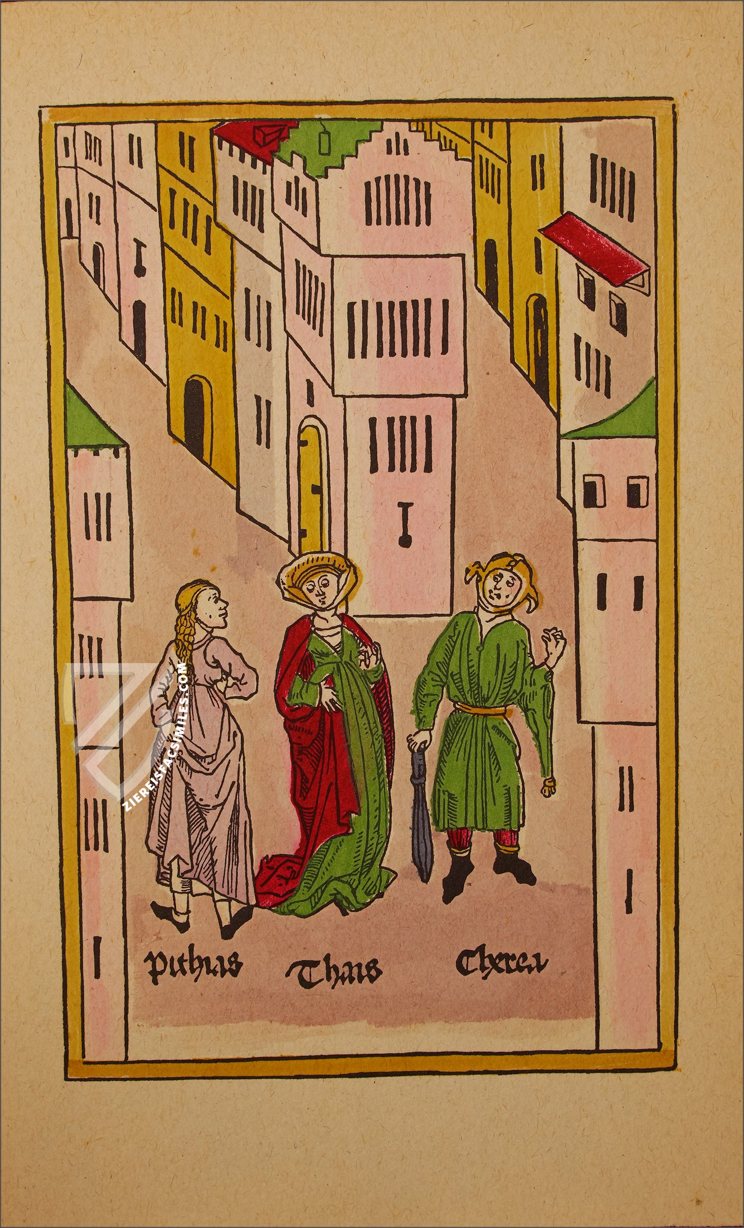 Eunuchus or “The Eunuch” is a comedic play written in the 2nd century BC by the Roman playwright Terence. Based on the Greek play written by Menander, its complex interconnecting plot centers around young love and a familial misunderstanding. It was the most successful of Terence’s plays during his lifetime and enjoyed a resurgence in popularity at the end of the Middle Ages. This German translation of the work was printed in 1486 with 28 full-page woodcuts that were colored by hand and set the story in late medieval Germany. As such, they offer details about the daily life, architecture, and fashion of a German city during this period.