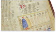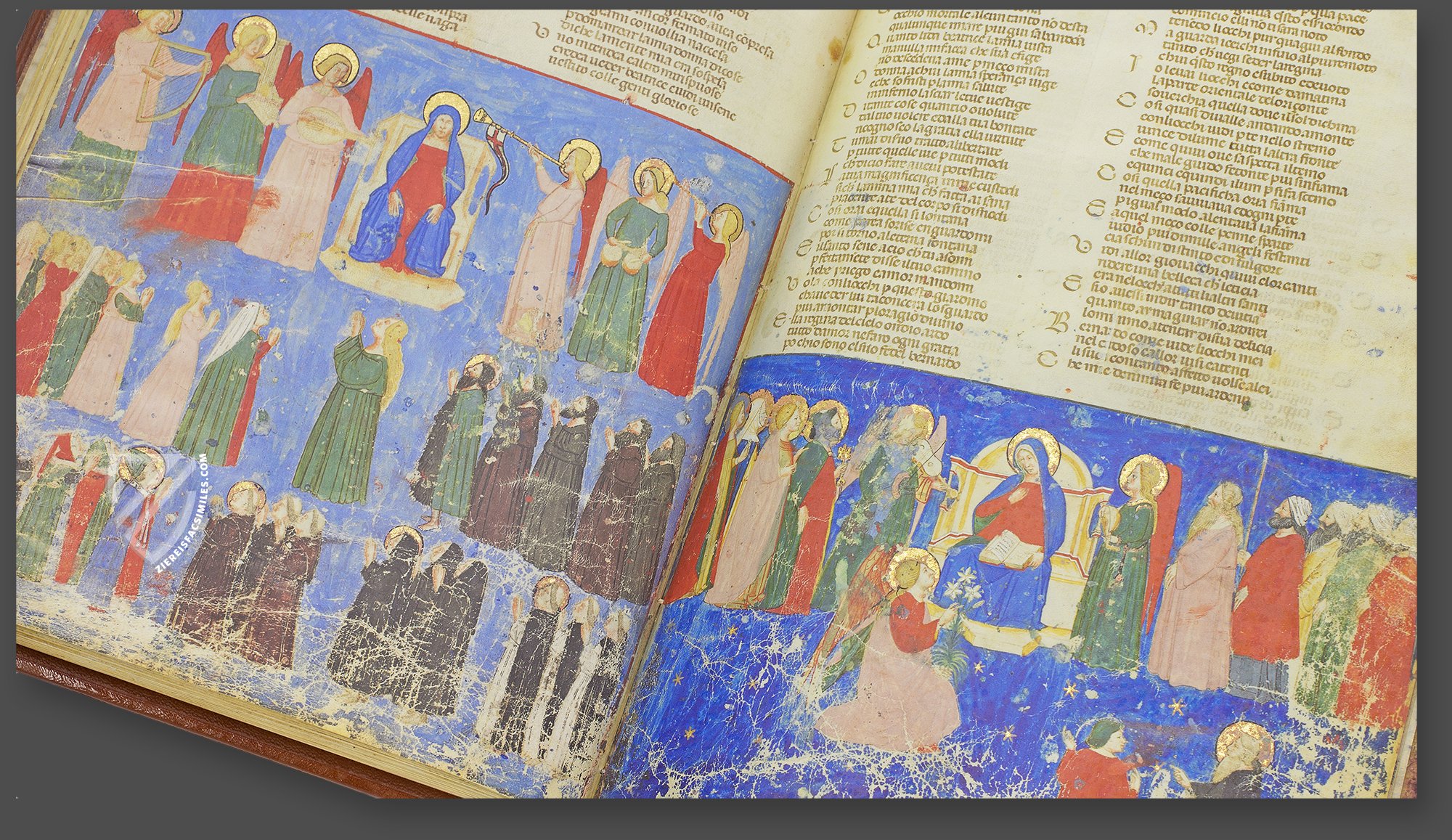 With his Divine Comedy, the Florentine author Dante Alighieri (1265β1321) successfully created the most important literary work of Italian literature and simultaneously established Italian as a literary language during his year in exile. On 156 pages, Dante relates his arduous trek through the three realms of the dead in first-person perspective. All 170 scenes from the story illustrate the two-columned text and, together with the magnificently historiated initials at the beginning of each song, provide the manuscript with a splendidly-colorful overall impression.