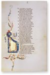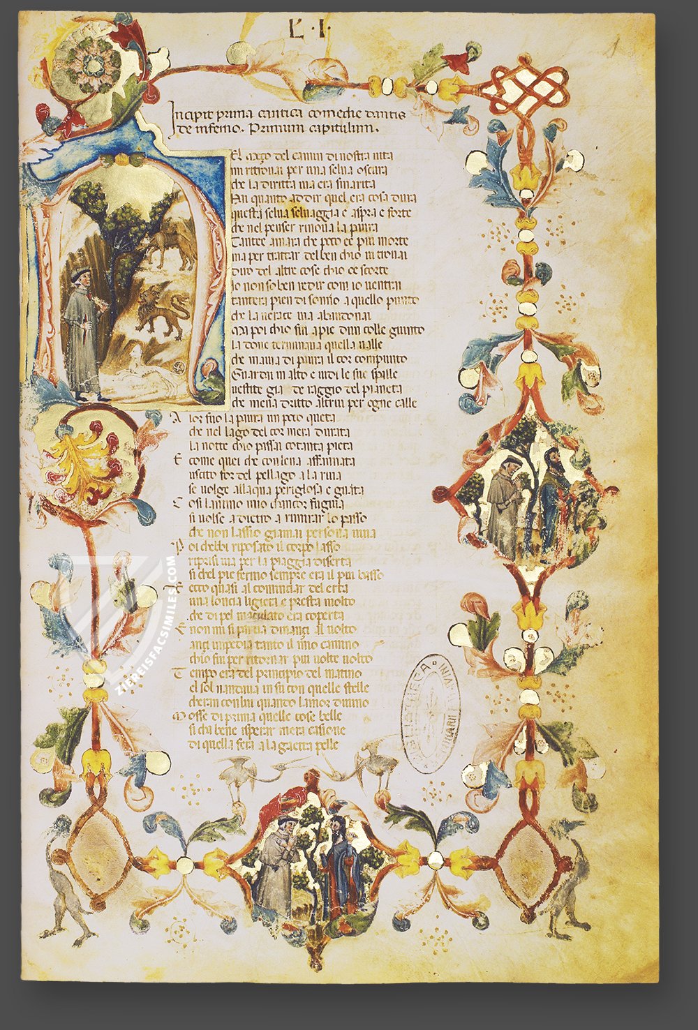Unable to flee the three beasts in the large historiated initial, Dante is finally rescued by Virgil in the medallion miniature at the bottom. The two set off on their adventure in the medallion on the right margin. This magnificent frontispiece, one of three, is adorned with gold leaf and richly colored tendrils populated by birds and drolleries.