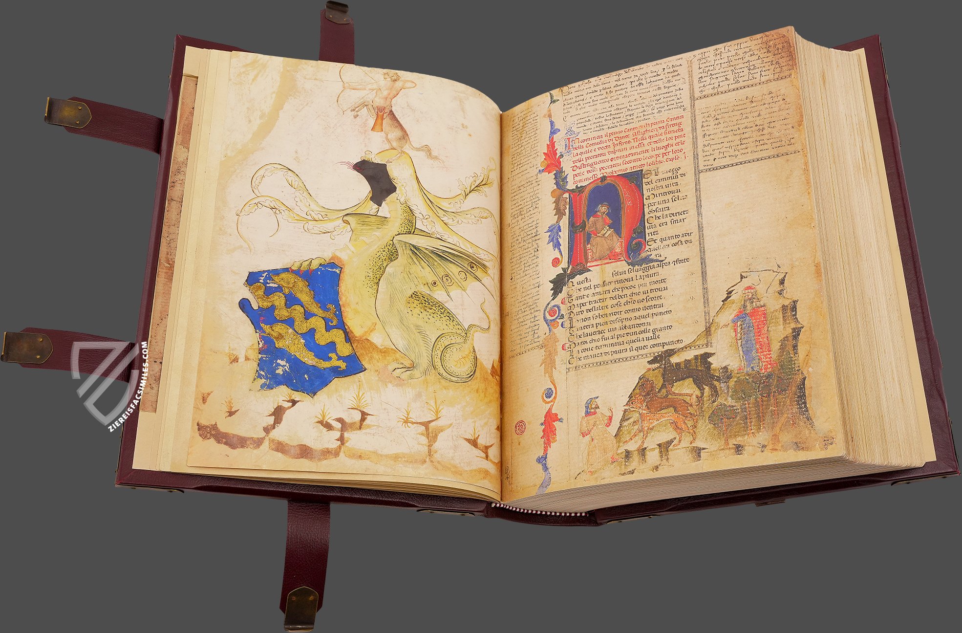 Few authors have been as influential as Dante Alighieri (1265β1321), author of the famous Divine Comedy. This work counts among a group of ca. 15 large format Dante manuscripts and was originally written with Gothic script by a skilled scribe in the 1360βs. 130+ miniatures created by four artists adorn the text, which is written in one column and designed with large historiated initials and bas-de-page miniatures at the beginning of each canto. The commentary and notes in the margins of the text were added by an unknown Florentine merchant for the purpose of explaining the numerous hidden meanings and references to various events and characters contained in the poem. Written around the end of the 14th century, the small, neatly written notes used a system of letters and numbers to link the original text with his commentary. After passing through the hands of various unknown owners, the manuscript eventually came into the possession of the Grand Duke of Tuscany, Cosimo de' Medici (1519β1574).